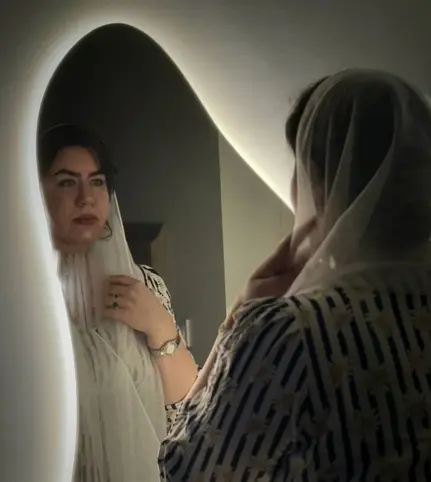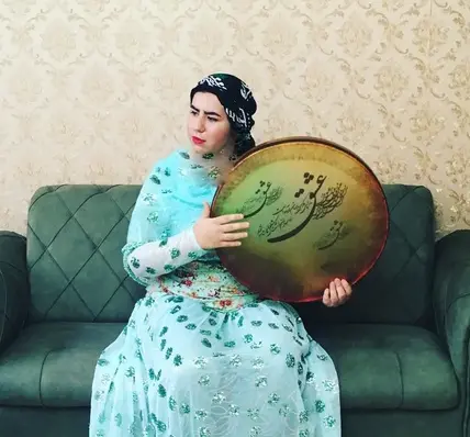 در تصاویر منزل صهبا شرافتی، یک دکوراسیون ساده اما پر از حس زندگی مشاهده میشود. در این تصویر، مبلمان سبز زمردی با طرح دوخت لوزی، فضایی کلاسیک و دلنشین را رقم زده است. دیوارهای با کاغذدیواری طلایی نقشدار، حالوهوایی سنتی به اتاق بخشیده و هماهنگی میان رنگ لباس صهبا و مبلمان، احساس لطافت و آرامش را تقویت میکند. حضور دف در تصویر نشاندهندهی علاقهی او به هنر و موسیقی ایرانی است و این فضا را فرهنگی و الهامبخش مینماید.