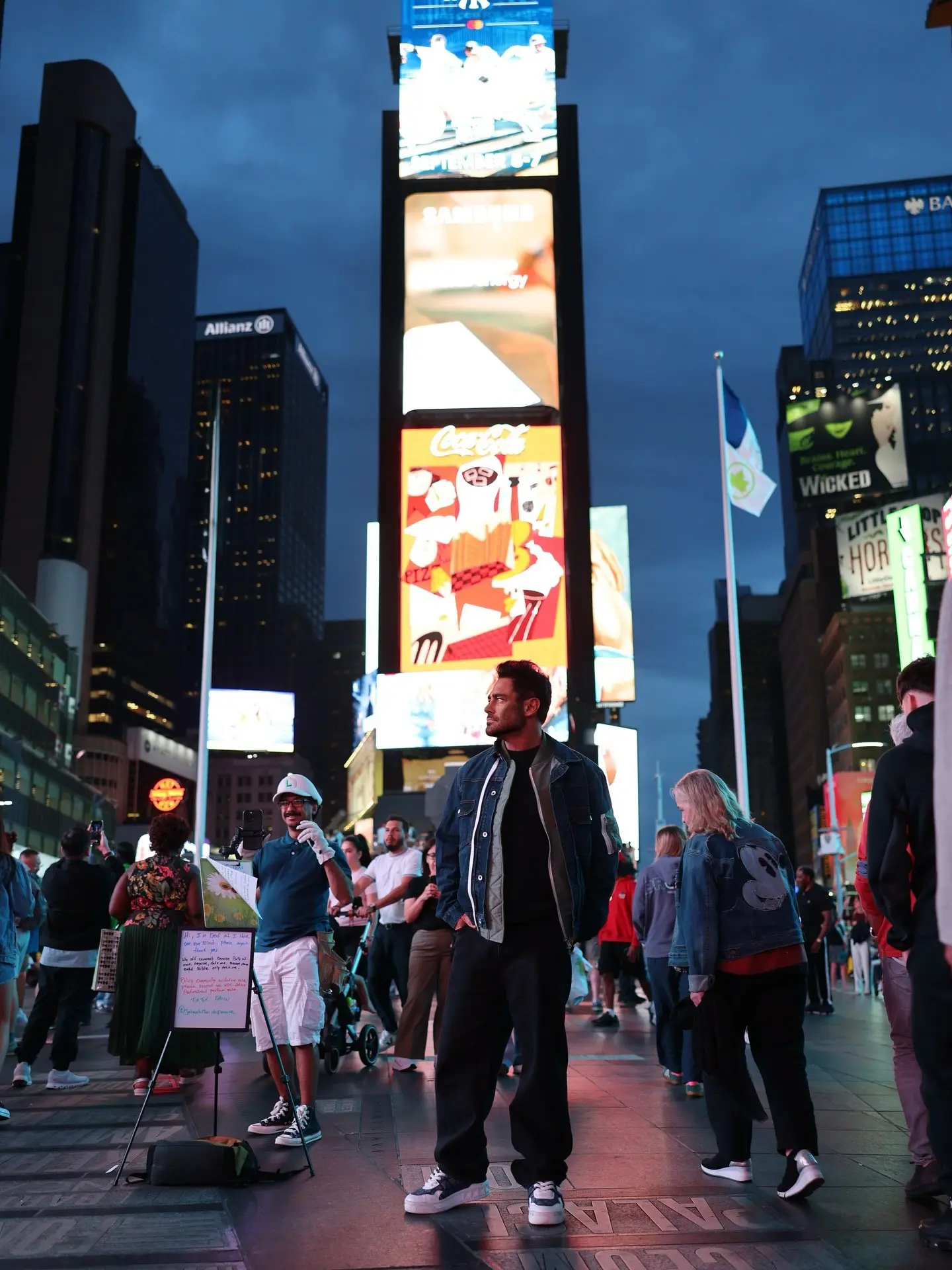 رضا گلزار در میدان تایمز نیویورک با استایل لوکس و جذاب