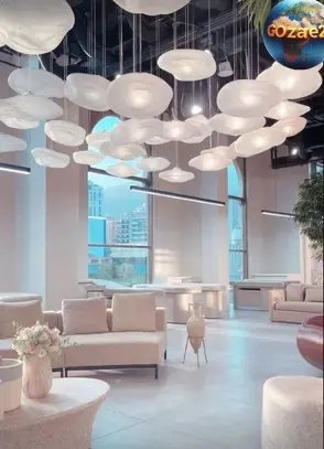 فضایی مدرن و جذاب با سقفهای بلند و رنگهای ملایم، طراحی شده به سبک ساره بیات، که هر جزئی از آن این زیبایی و شکوه را تقویت میکند. یکی از ویژگیهای بارز این فضا، سقفهای بلند و طراحی باز آن است که حس عظمت و شکوه را به بیننده منتقل میکند. رنگ سفید به عنوان رنگ اصلی در کنار سایههایی از رنگهای ملایم مانند صورتی گلبهی، فضایی لوکس و آرامبخش را رقم زده است. انتخاب این طیف رنگی نه تنها نشانگر مدرن بودن فضا است، بلکه حس تمیزی و روشنایی را به مخاطب القا میکند.