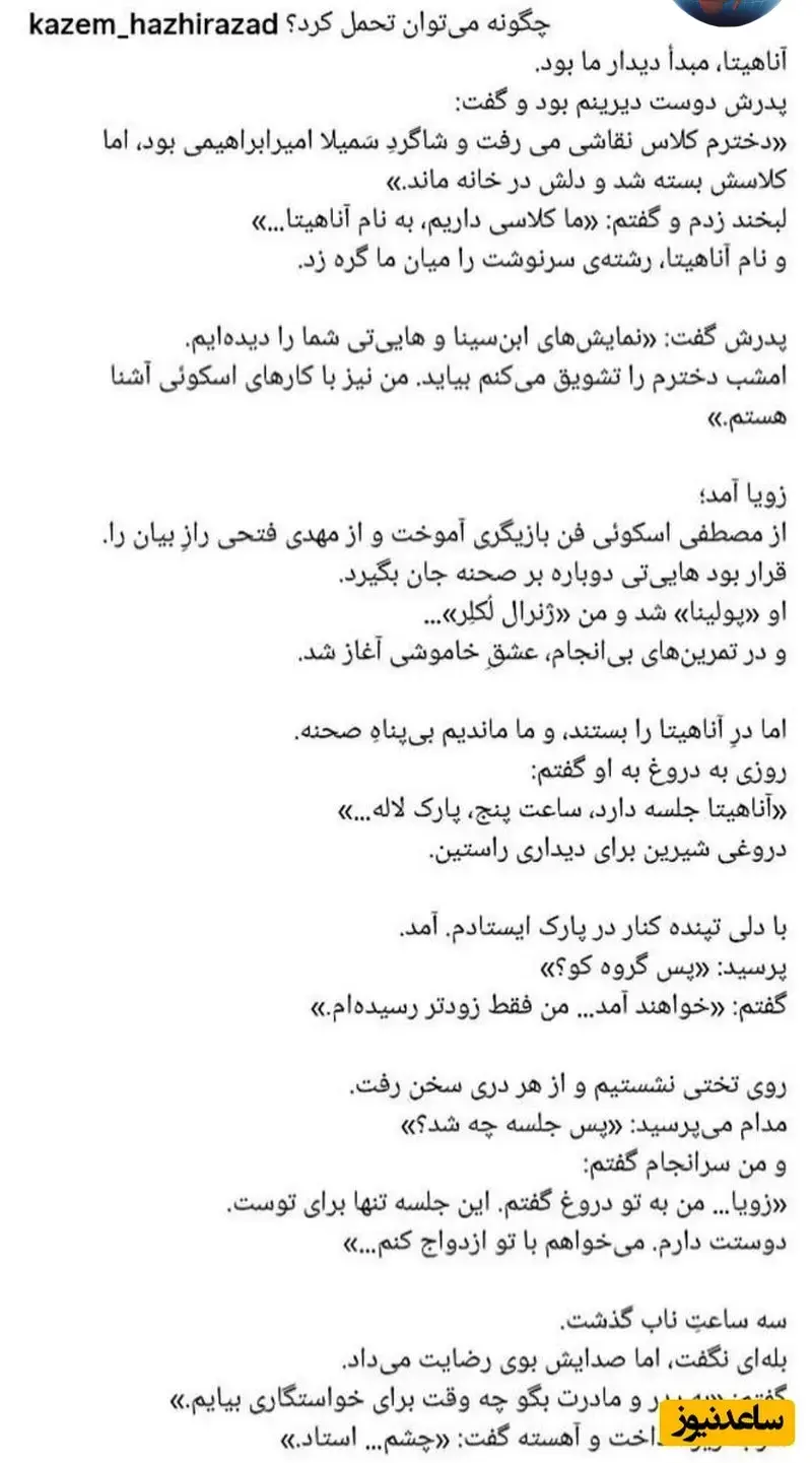 پانزدهم آبان ۱۴۰۴، وقتی از اجرای تئاتر برگشتم، نیمی از بدنش بر تخت بود و نیمی آویزان...