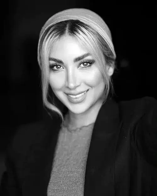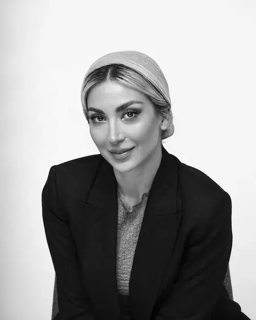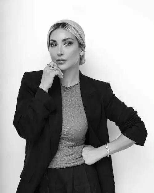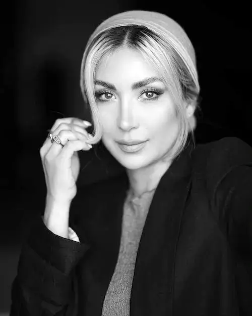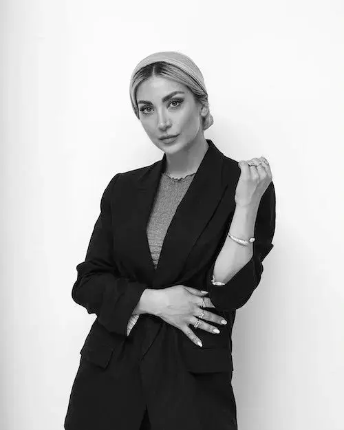 در این تصاویر، مینا با کت بلیزر مشکی و سربندی که روی موهایش قرار دارد، ظاهر شده است. این استایل کلاسیک و ساده، ظاهری شیک و منظم به او بخشیده است و با وجود افکت سیاه و سفید، هنوز هم جلوهای مدرن و جذاب در تصاویر دیده میشود.