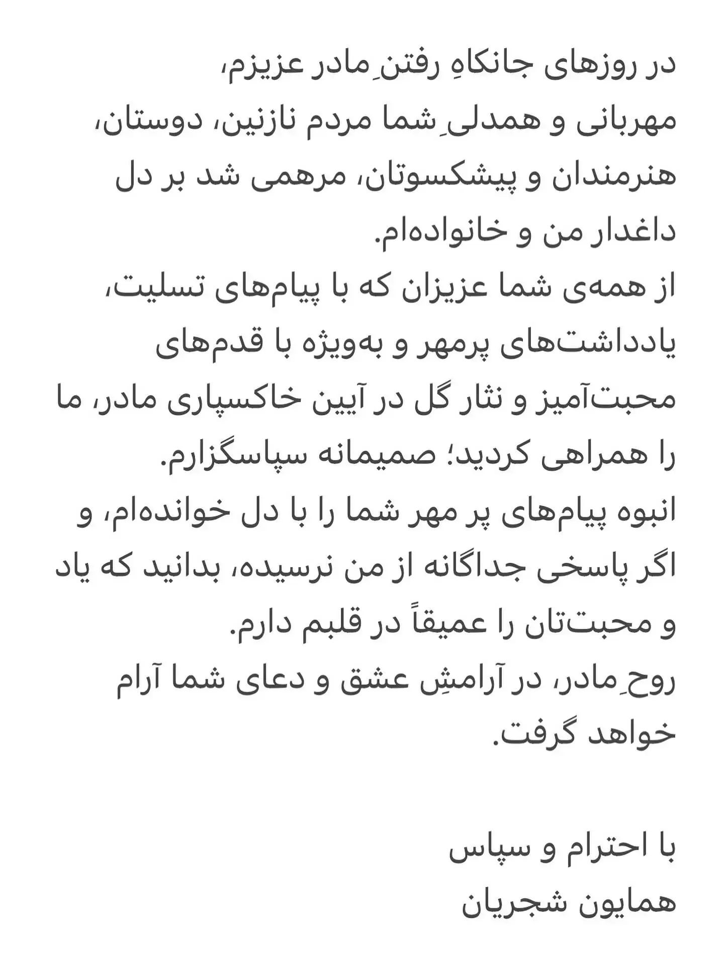 همایون شجریان پس از درگذشت مادرش، یک استوری منتشر کرد و در آن از پیامهای تسلیت هنرمندان و آشنایان تشکر نمود و به تمامی آنها پاسخ داد.