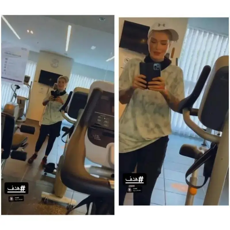 سحر قریشی در حال تمرین در باشگاه ورزشی است.
