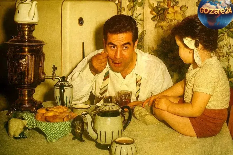 در تصویر، آشپزخانهای با سماور برنجی درخشان، سرویس چایخوری طرحدار، پردههای گلدار و یخچال قدیمی دیده میشود؛ همه این عناصر نمادهای یک خانه ایرانی قبل از انقلاب هستند. این صحنه که همراه با حضور دخترش ثبت شده، تصویری کوتاه اما پر از نوستالژی از روزگاری ساده و پر از محبت را زنده میکند.