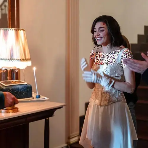 در یکی از استایلهای جشن تولد، هانده با یک تاپ کمر فنردار و درخشان ظاهر شد؛ این تاپ با دامن کوتاه سفید هفتیهشتی ست شده بود و به همراه دستکشهای ساتن سفید، استایلی دراماتیک و شیک خلق کرد. این ترکیب هم زنانه و هم خاص بود و برای جشن تولد و عکاسیهای اینستاگرامی مناسب به نظر میرسید.