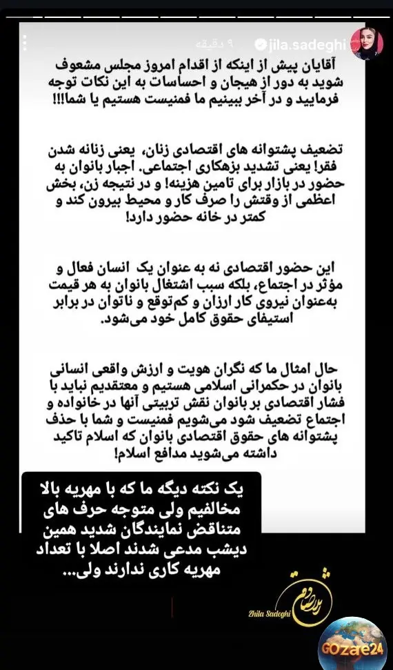 صادقی در استوری خود ضمن ابراز نگرانی درباره تضعیف حقوق زنان، از نمایندگان خواست قبل از تصویب چنین طرحهایی، تاثیرات آن بر زندگی واقعی زنان و مردان را با دقت بررسی کنند. او تأکید کرد که مهریه برای بسیاری از زنان تنها یک ابزار حمایتی در شرایط بحرانی است و نباید بدون ارزیابی جامع، نقش بازدارنده و حمایتی آن نادیده گرفته شود.