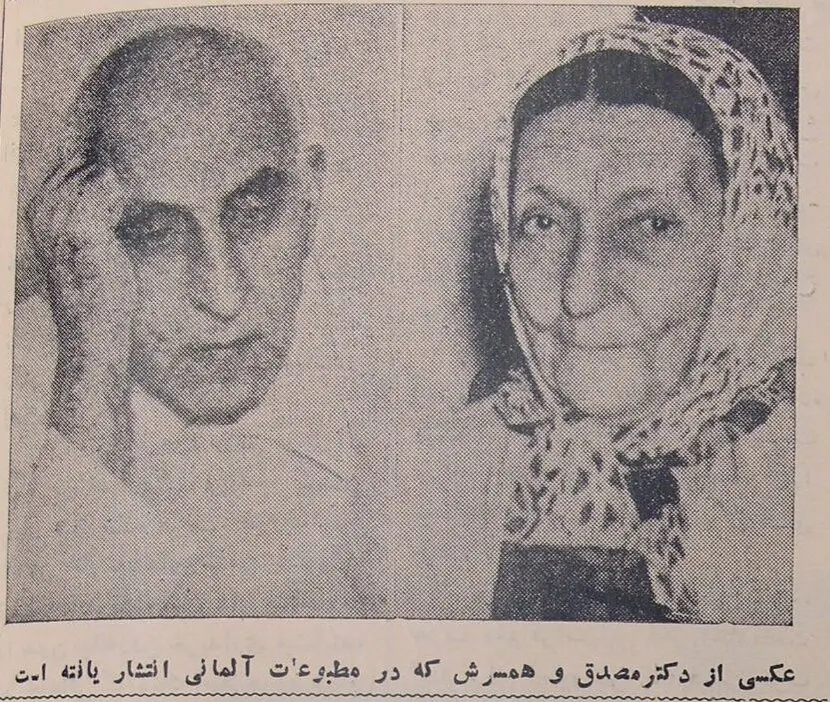 تصویر تاریخی دکتر مصدق و همسرش در دادگاه ۱۳۳۲، لحظهای دراماتیک از دوران کودتای انگلیسی در ایران، منتشر شده در مطبوعات آلمان و بازنشر در «خواندنیها».