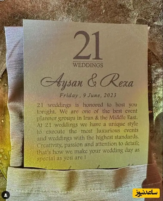 در ادامه، تصویر کارت عروسی محمدرضا گلزار و آیسان آقاخانی را مشاهده میکنید که متن آن به زبان انگلیسی نوشته شده است.