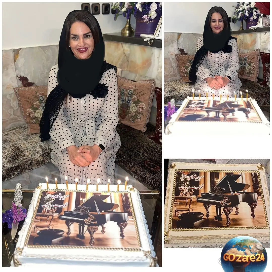 تصویر کیک تولد مجلل همسر سالار عقیلی با نقش پیانو در منزل دنج و سنتی همراه با جزئیات آشنایی و زندگی هنری حریر شریعتزاده نوازنده مشهور ایرانی.