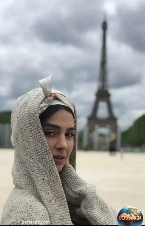 عکاسی خلاقانه لاله مرزبان مقابل برج ایفل با حجاب زیبا
