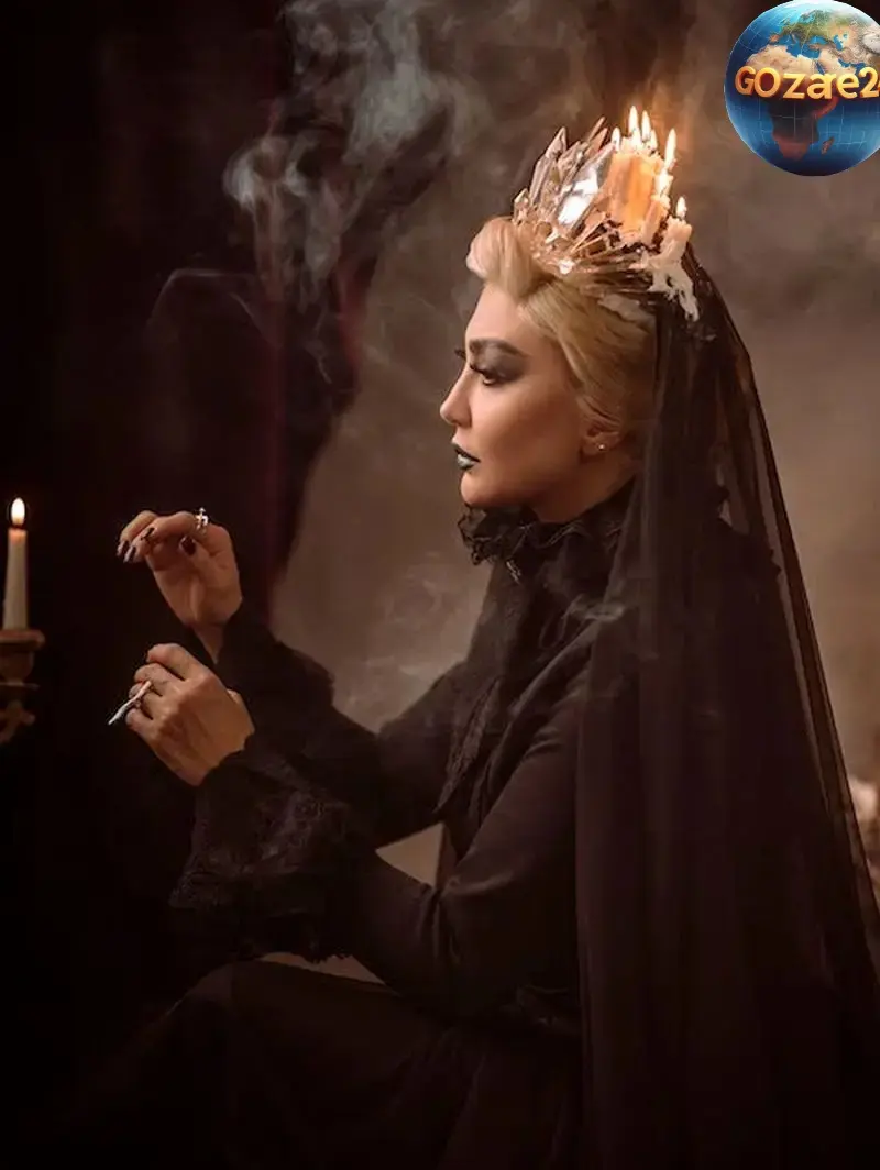 مریم معصومی با تاج کریستالی نمادین و استایل مشکی، نماد قدرت زنانه در تاریکی، ترکیبی از زیبایی، نمادگرایی و پایداری در تصاویر هنری و تأملبرانگیز را به نمایش میگذارد.