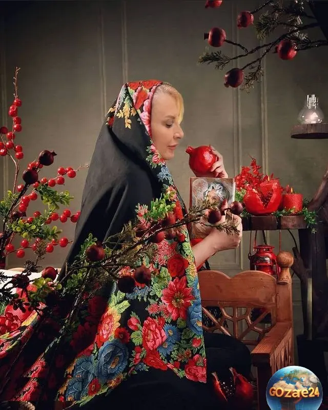 تصویر شب یلدای مرجانه گلچین با شال گلدار جذاب و هنرمندی که در هنرستان موسیقی نوازندگی تار خوانده است.