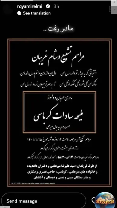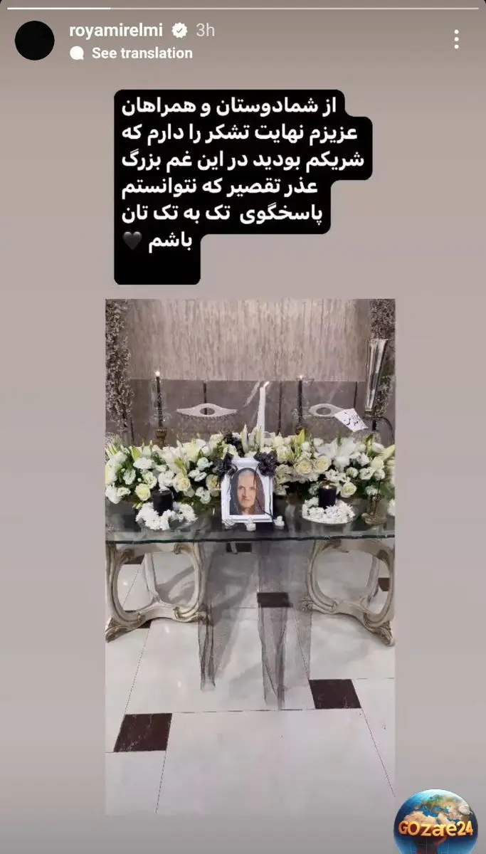 رونمایی از اعلامیه ترحیم و مراسم عزاداری مجلل مادر رویا میرعلمی در بهشت زهرا با حضور هنرمندان و بستگان