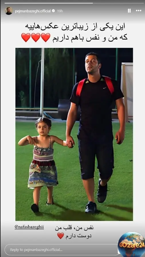 پژمان بازغی با انتشار استوریای شامل عکسی از خودش و دخترش، نفس بازغی، نوشت: «این یکی از زیباترین تصاویری است که من و نفس با هم داریم. نفس من، قلب من، دوستت دارم.»