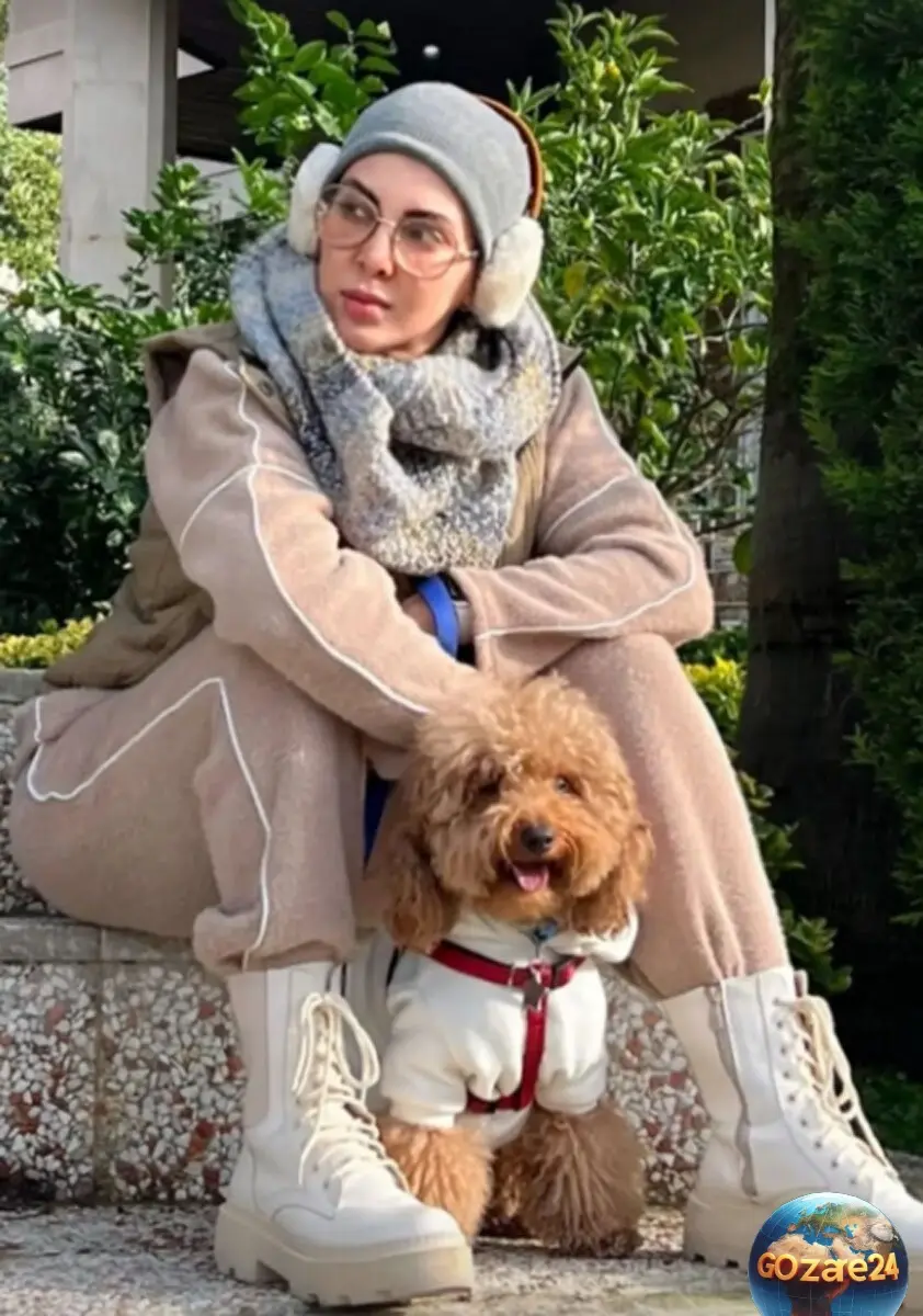 عکس جالب لیلا بلوکات در هوای سرد زمستانی با سویشرت خاص و حیوان خانگیاش
