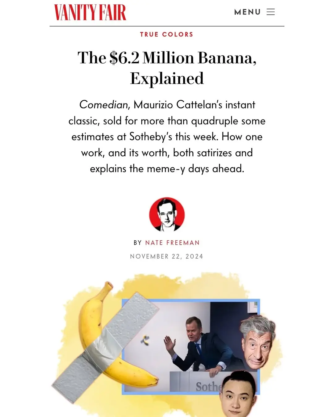 شاید باور کردنش سخت باشد، اما این مفهوم ساده – نه خود موز فیزیکی – در یک مزایده به قیمت ۶ میلیون و ۲۰۰ هزار دلار فروخته شد. کاتلان با انجام این کار در واقع قصد داشت نظام حاکم بر بازار هنر را مورد نقد و بررسی قرار دهد، نظامی که امروزه ارزش آثار هنری را نه بر اساس عمق معنایی، بلکه بر اساس میزان وایرال بودن و جلب توجه ارزیابی میکند.