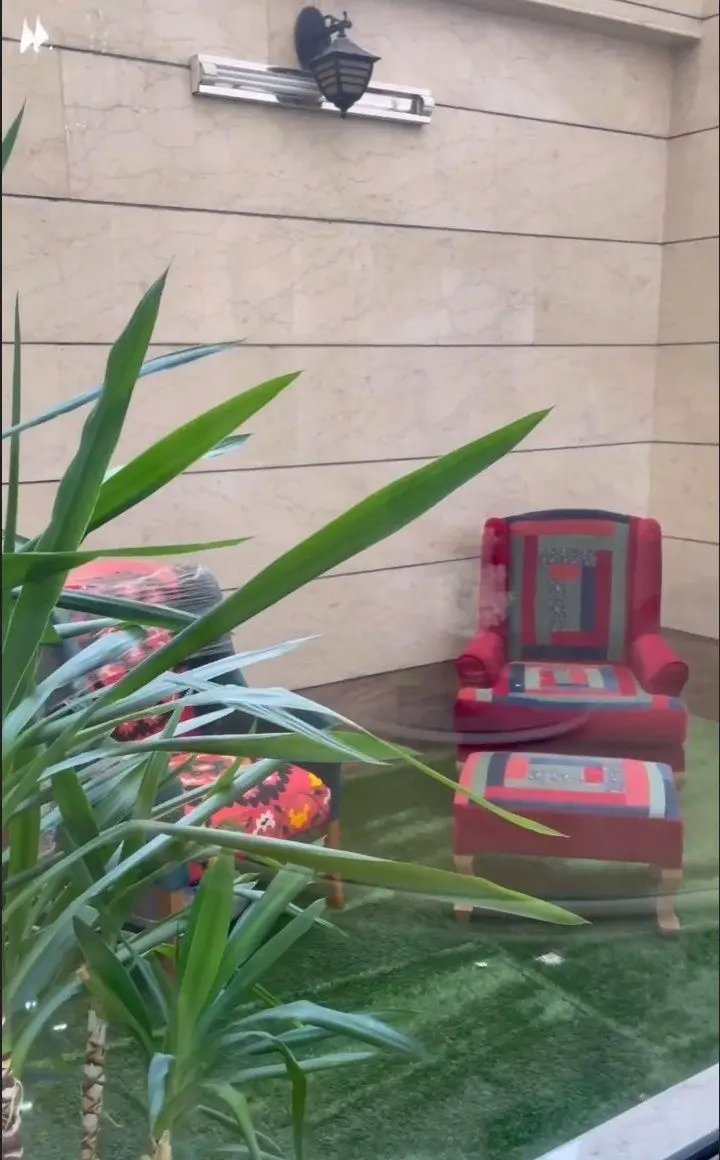 در یکی از گوشههای خانه، پاسیو و نورگیر قرار دارد که با گذاشتن یک گلدان بزرگ پر از گیاهان سبز، حس زندگی و سرزندگی را به فضا بخشیده است. نکته جالب این است که مبلمان پاسیو نیز با رنگها و طرحهایی تقریبا سنتی و در هماهنگی با رنگهای سبز و قرمز انتخاب شده است. کفپوش چمن مصنوعی، زیبایی فضای سبز را تکمیل کرده و محیطی دلنشین ایجاد کرده است.