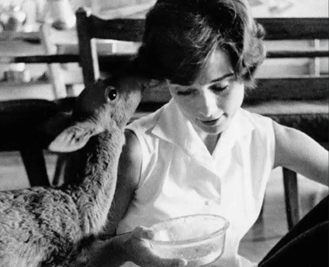 تصویر آرامبخش از خانه ادری هیپبورن در دهه ۵۰ میلادی؛ نماد زیبایی، ظرافت و محبت در کنار آهو خانگی
