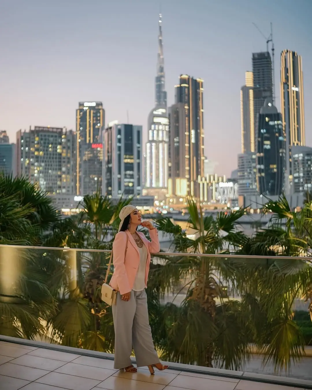 کفپوش روشن، نردههای شیشهای شفاف و ردیف نخلهای سبز در پایین دست، فضایی مدرن و آرام در تراس شهری را به تصویر میکشد. تابش نور غروب بر روی ساختمانهای بلند، جو تصویر را گرم و جذابتر کرده و فضا را شبیه به یک بالکن یا سکوی تماشای لوکس در مرکز دبی نشان میدهد.