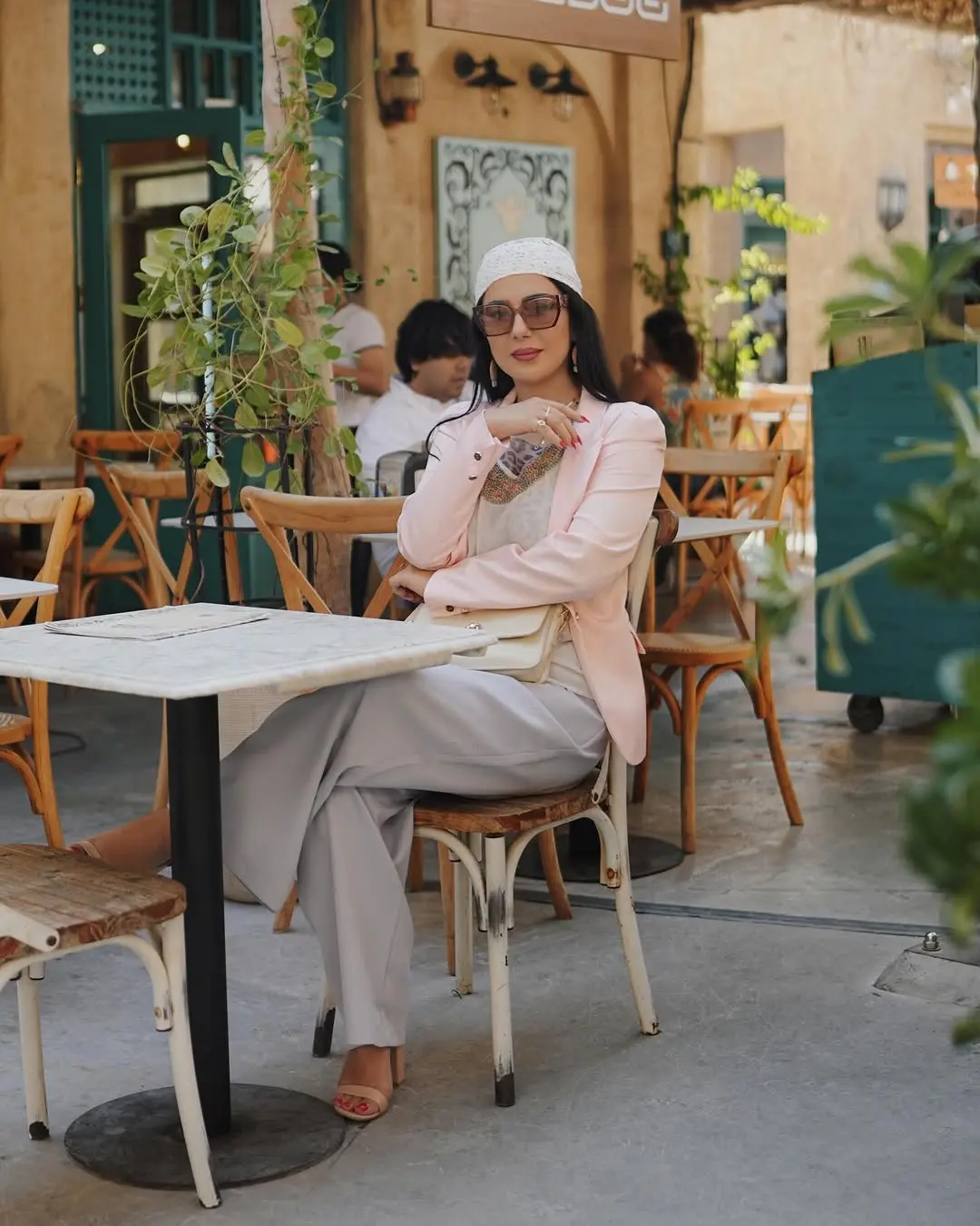 در این تصویر، کافهای در فضای باز با طراحی سنتی و الهامگرفته از معماری عربی دیده میشود. دیوارهای گِلی رنگ با بافت قدیمی، پنجرههای فیروزهای سبز، میز و صندلیهای چوبی که نشان از فرسودگی دارند، و گیاهان آویزان، فضایی دلنشین و گرم را به وجود آوردهاند. نور طبیعی و تزئینات ساده، احساس یک بازار یا محله قدیمی بازسازیشده را در ذهن تداعی میکند.