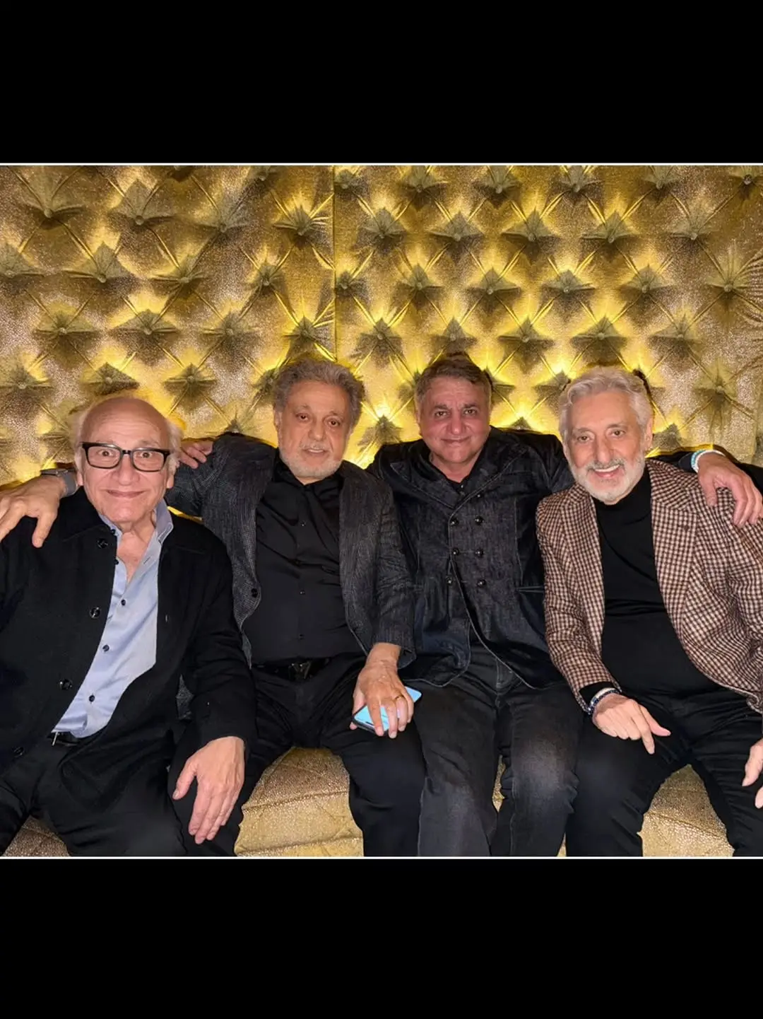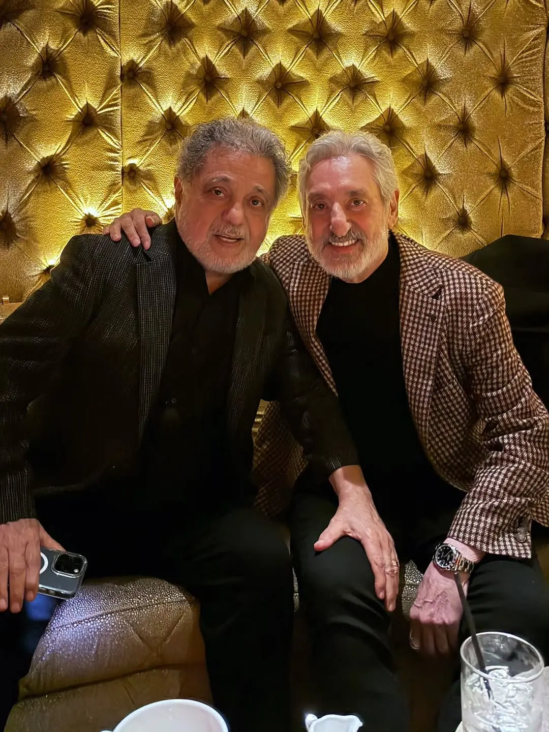 در پشت سر آنها، دیواری لمسهکوب با روکش طلایی قرار گرفته است؛ سطحی با بافتی منظم و درخشان که فوراً احساس شکوه و تاریخ را القا میکند. در ادامه همین تم، مبلمان طلایی و راحت به چشم میخورد که فضای نیمهکلاسیک و گرمی را ایجاد میکند. نور کمفشار و کهربایی که بر دیوار و چهرهها میتابد، تصویر را نرمتر کرده و حس صمیمیت و گرما را بیشتر نمایان میسازد.