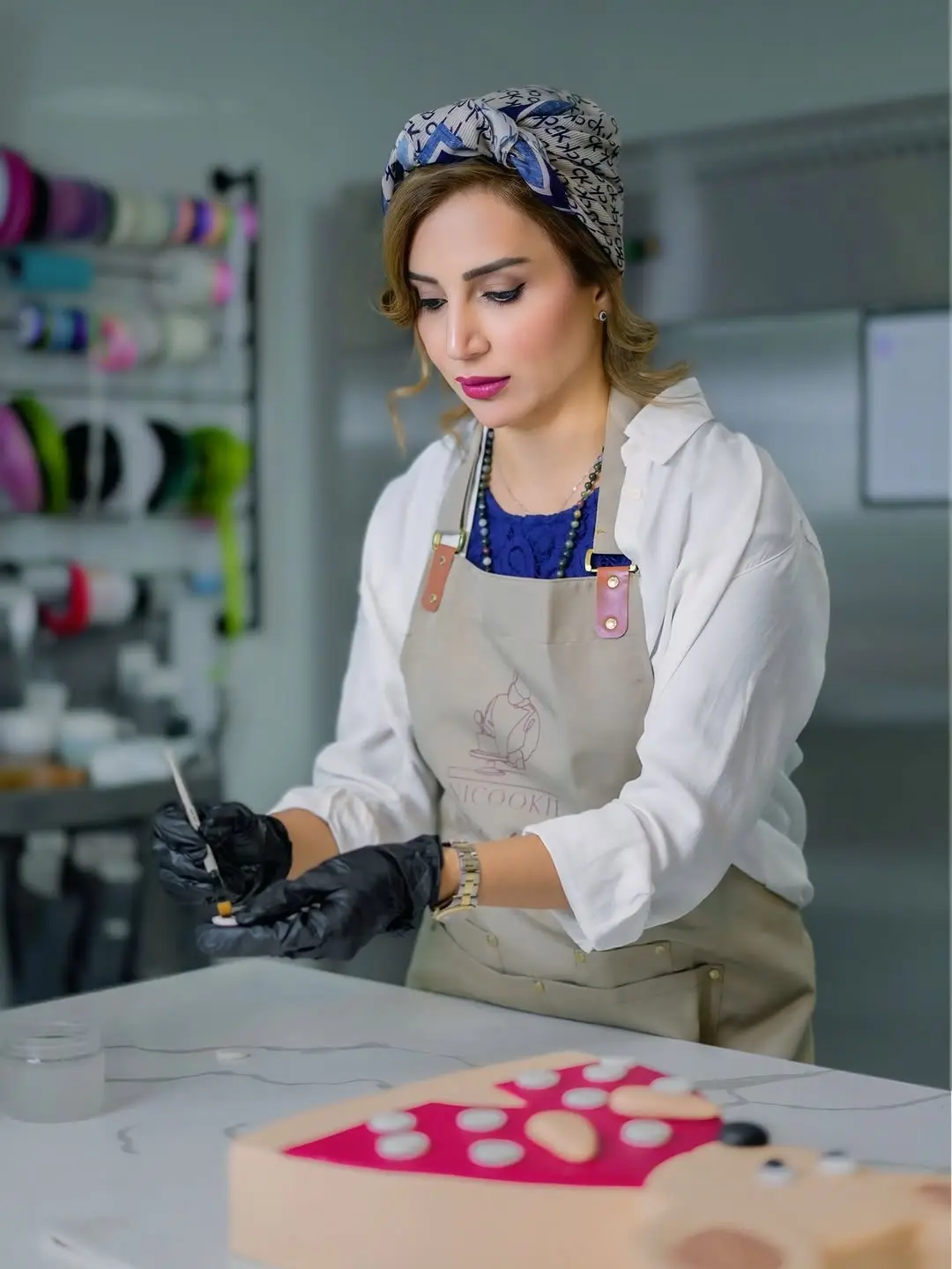 او در یک آشپزخانه مجهز به تجهیزات حرفهای برای پخت و تهیه کیک و شیرینی، کیک تولد خود را خودش تهیه کرده است.