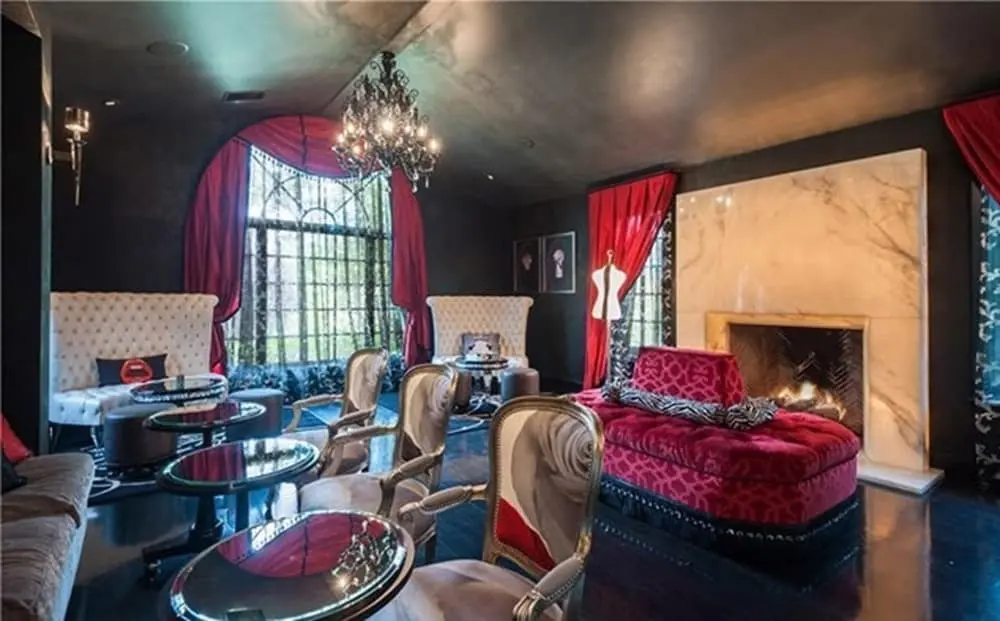 در مرکز فضای پذیرایی، یک شومینه قرار دارد که همراه با مبل لمسه دوزی شده قرمز رنگ، فضایی کلاسیک و لوکس را به وجود آورده است. رنگ قرمز پردهها، گرما و انرژی را به محیط افزوده و در میان رنگهای خنثی و تیره، جلوهای خاص دارد. چیدمان منحصربفردی از مبلمان لمسه دوزی شده و چند مبل تکی نئوکلاسیک در کنار میزهای جلومبلی آینهای به چشم میخورد، که ترکیبی متفاوت و جذاب را رقم زده است.