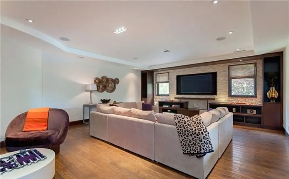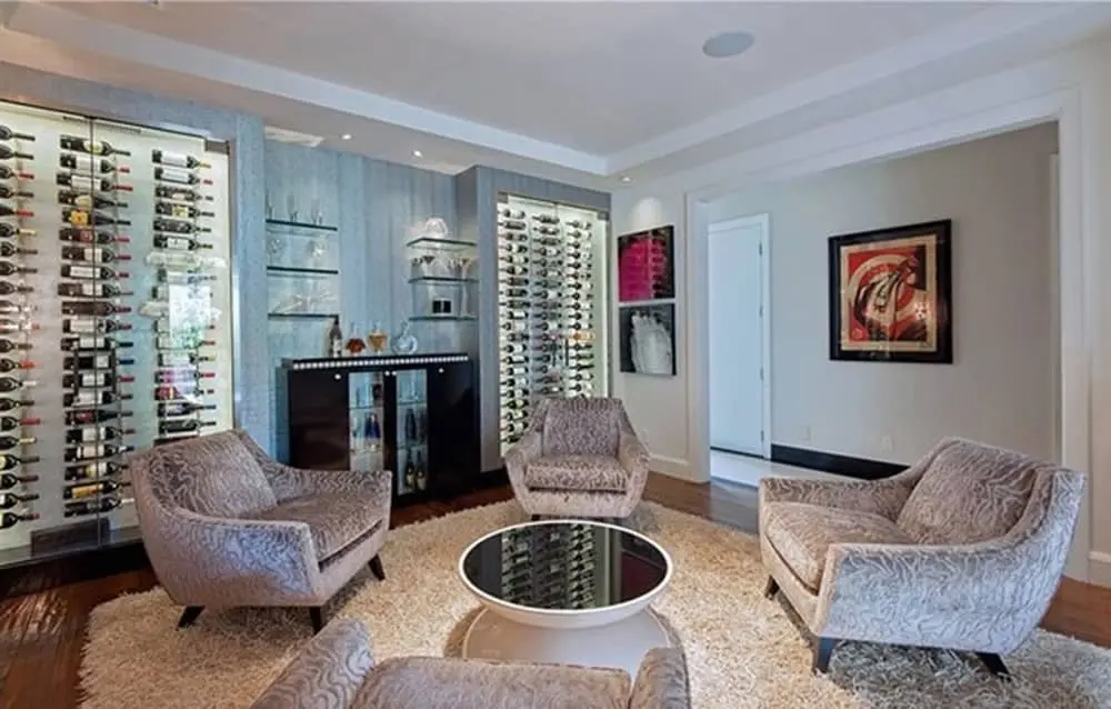 یکی از بخشهای خاص این خانه بزرگ، اتاق نوشیدنی است. خانه آنجلینا جولی برای مهمانان ویژه و خاص خود طراحی متفاوتی دارد. در این فضا، انواع نوشیدنیها به زیبایی دکور شدهاند و با چهار مبل مدرن و یک میز پذیرایی، طراحی داخلی آن تکمیل شده است. نورپردازی و ایدهپردازی بر روی بوفههای دیواری، جلوهای زیبا و منحصر به فرد ایجاد کرده است. همچنین، استفاده از فرشهای پشمی و قابهای رنگی، ظاهری مدرنتر و جذابتر به این فضا بخشیده است.