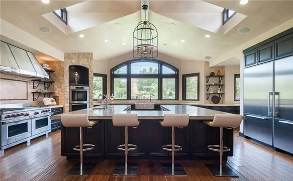 بدون شک، خانهای با این اندازه نیازمند آشپزخانهای بزرگ و مجهز است. در این قصر، آشپزخانه با طراحی مدرن و امروزی ساخته شده است. دیوار آجری، کفپوش پارکت و جزیره بزرگ به شکل یو، از عناصر بارز این فضا هستند. پنجره بزرگ موجود در آشپزخانه، نور طبیعی فراوان را وارد میکند و منظرهای سبز و دلنشین را به نمایش میگذارد.