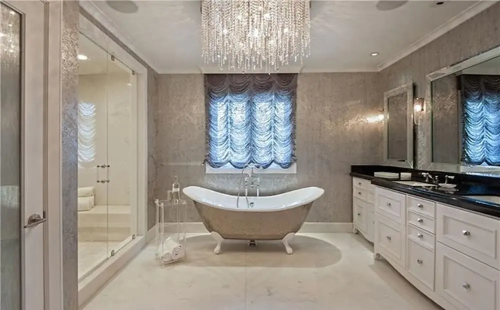 سرویس بهداشتی این منزل وسیع، با ابعادی متناسب با فضاهای دیگر، بزرگ و مجلل طراحی شده است. کفپوش از سنگ سفید استفاده شده و آینههای بزرگ و زیبا، همراه با درهای شیشهای و لوسترهای بزرگ و شیک، این فضا را هم از نظر زیبایی و هم از نظر کارایی، بسیار جذاب و لوکس ساخته است.