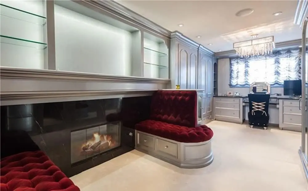 رنگها و فرمهایی که در فضای پذیرایی مشاهده میشد، در طراحی اتاق کار نیز به کار رفته است. مبل لمسهکاری شده با رنگ قرمز در کنار شومینه شیشهای قرار گرفته است. همچنین، تعداد زیادی کمد و شلف در اتاق تعبیه شده است که فضایی مناسب برای قرار دادن وسایل مختلف فراهم میکند.