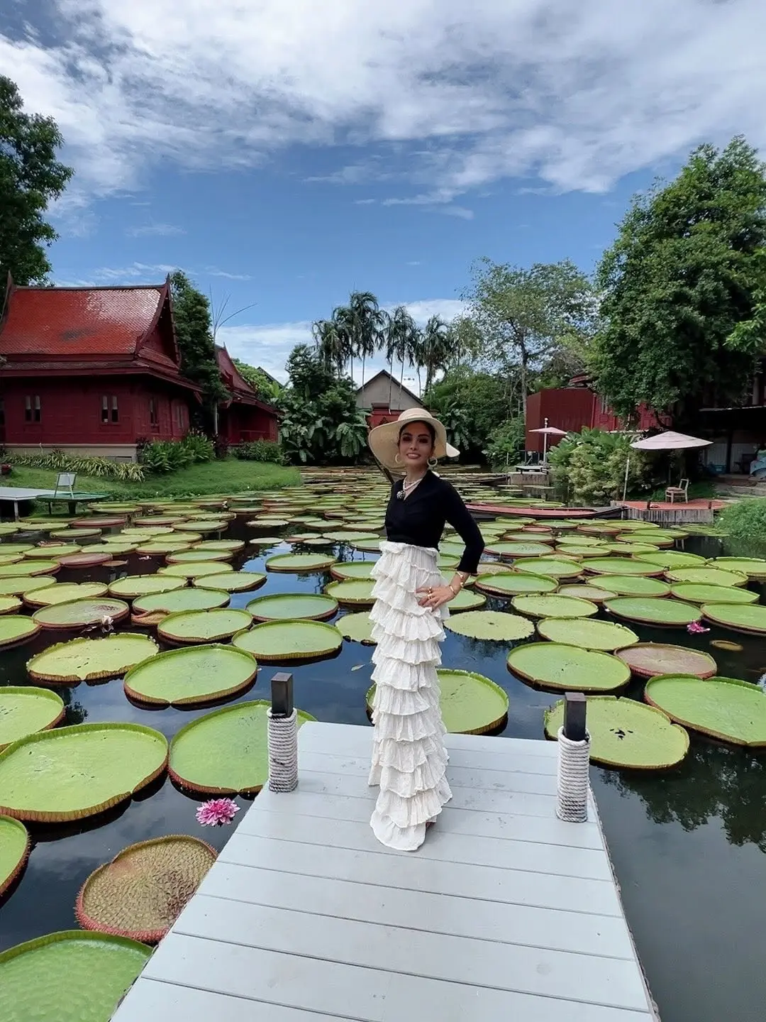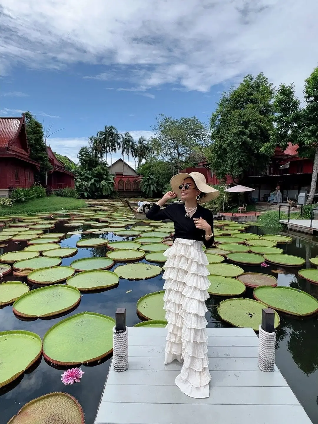 در این تصاویر، او در محیطی خیالی و دیدنی دیده میشود؛ جایی که خانههای سنتی با سقفهای شیروانی قرمز در کنار دریاچهای پر از گلهای نیلوفر قرار دارند و فضایی را خلق کردهاند که یادآور کارتپستالهای قدیمی و رمانتیک است.