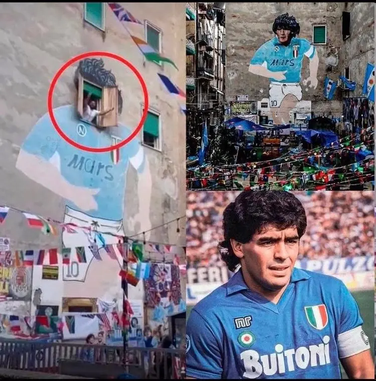 در شهر ناپل، یک نقاشی دیواری بزرگ از دیگو مارادونا بر روی دیوار یکی از ساختمانها نقش بسته است. این تصویر تنها با افتخار ناپولی و قهرمانیهای تیم در سریآ زنده میشود. در وسط چهره مارادونا، یک پنجره کوچک قرار دارد که در روزهای خاص و تاریخی باز میشود، مانند قهرمانی ناپولی در سریآ یا پیروزی آرژانتین در جام جهانی، و اینگونه تصویر به زندگی میپیوندد.