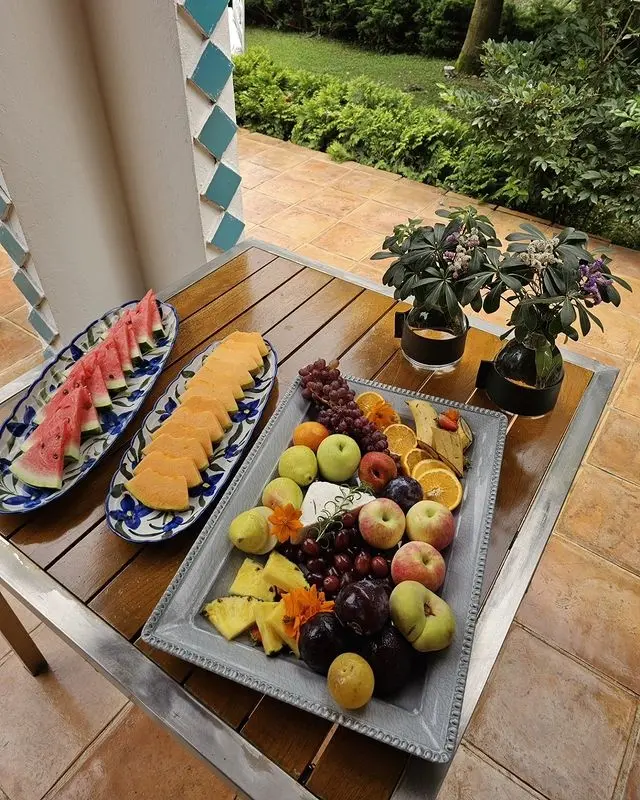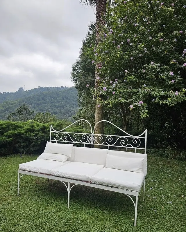 مبلمان فرفورژه در مرکز باغ، ما را به دنیای فیلمهای کلاسیک اروپایی میبرد و با رنگ سفید خود، در دل طبیعت حس آرامش عمیقی را القا میکند. کاشیهای آبی به شکل لوزی و در ردیفهای منظم، یادآور سبک مدیترانهای هستند و انتخاب میز چوبی نیز به خوبی با این سبک معماری هماهنگ شده است، که نشاندهنده دقت در طراحی و هارمونی فضا است.
