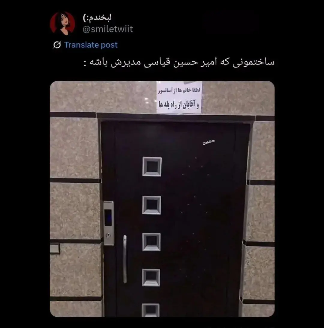 آنها در توضیح این تصویر اعلام کردند: «اگر امیرحسین قیاسی مدیر پروژه ساختمانی بود، احتمالاً آسانسورها بهطور خاص و منحصربهفرد برای خانمها طراحی میشد!»