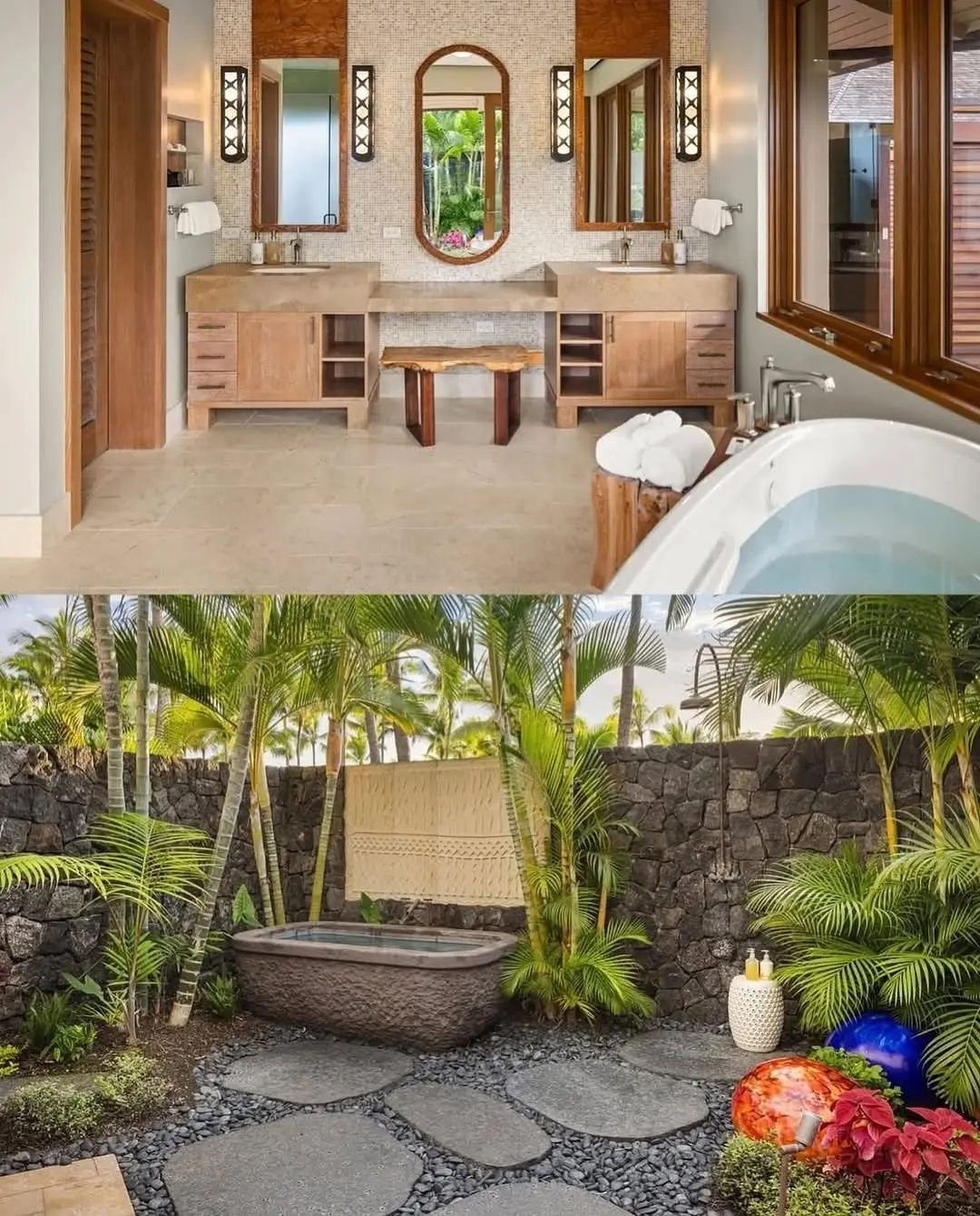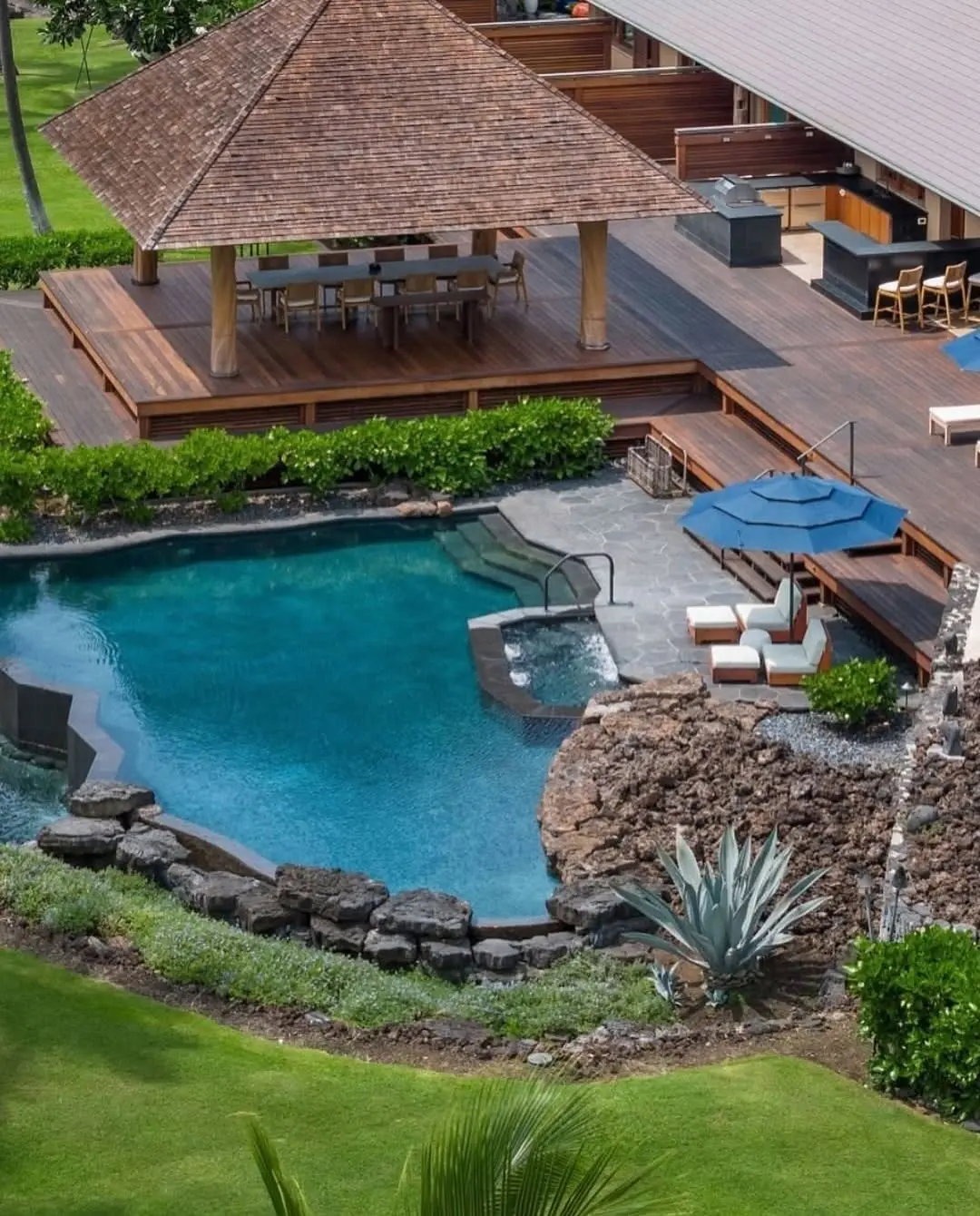 در قسمت بیرونی، تراسها و فضاهای سبز با طراحی ساده و همراستا با سبک معماری اصلی، ارتباطی زیبا و طبیعی بین ساختمان و محیط اطراف برقرار کردهاند. مسیرهای ورودی، حیاط و منطقه استخر نیز با دقت طراحی شدهاند تا علاوه بر ایجاد جذابیت بصری، تجربه فضایی یکنواخت و منسجم را به بازدیدکنندگان ارائه دهند.