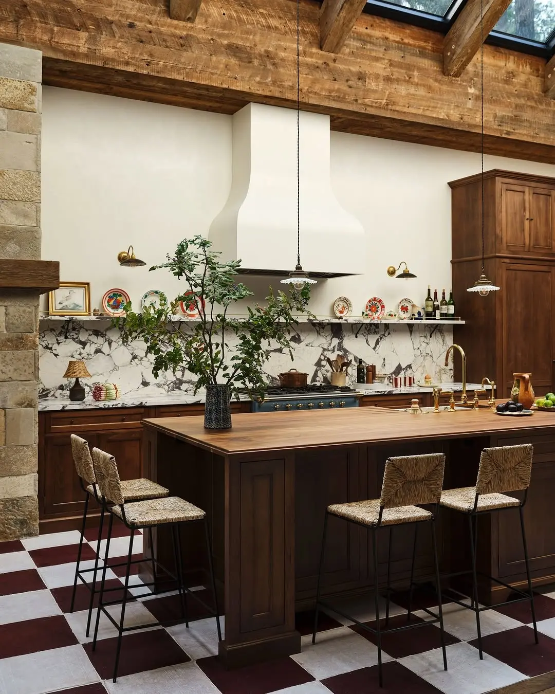 آشپزخانه با میز و کابینتهای چوبی و کفپوش طرح شطرنجی، دیوارهای تزیینشده با بشقابهای رنگارنگ و زیبا، فضایی را ایجاد میکند که ترکیبی از گرمی و هنر را به نمایش میگذارد.