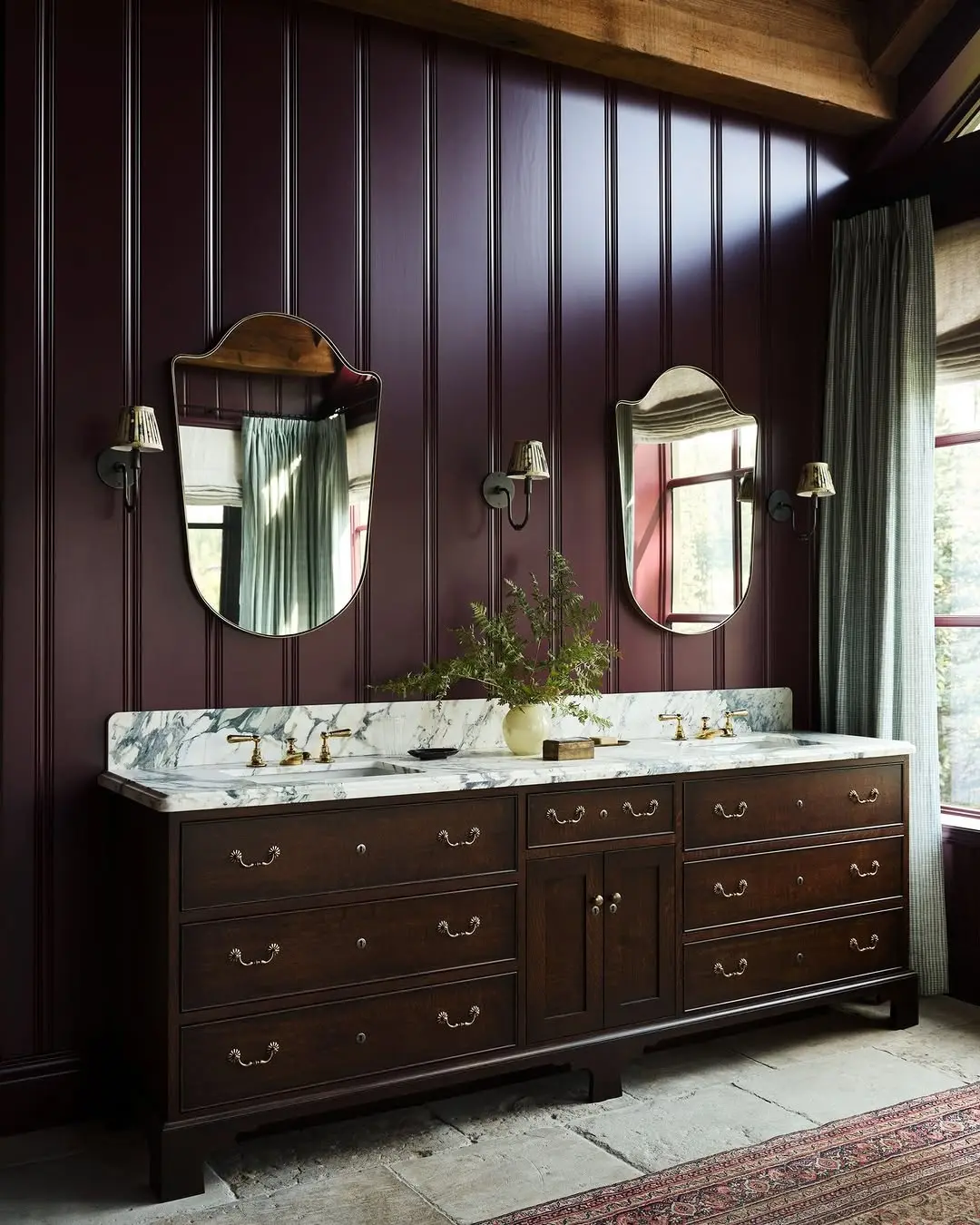 سرویس بهداشتی با طراحی چوبی دربروشویی، مجهز به دو آینه و حضور یک گیاه خاص، فضای طبیعی و دلنشین خانه را تکمیل میکند.