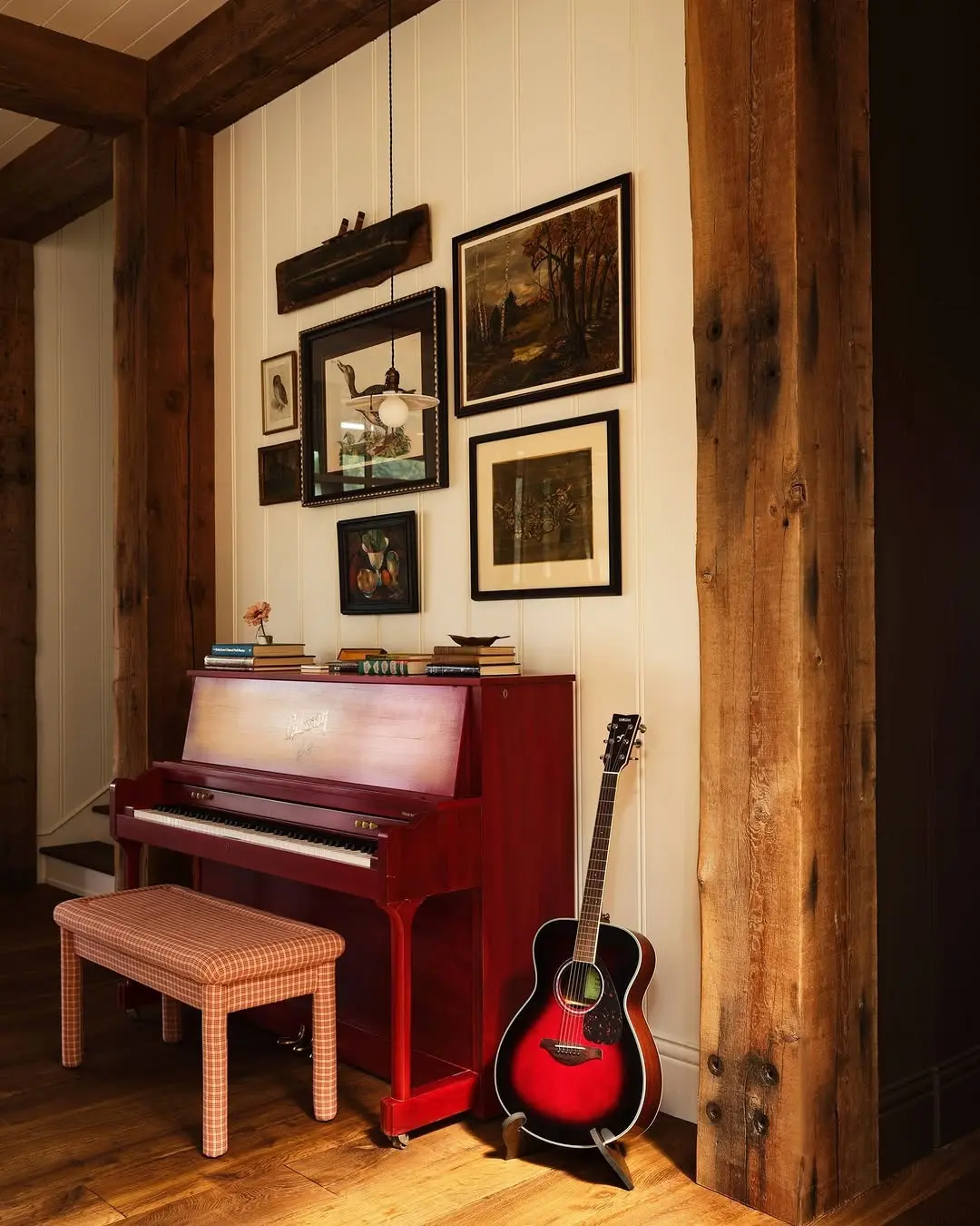 اتاق موسیقی با دیوارها و کفپوش چوبی، دارای تابلوهای مناظر طبیعی و تصاویر حیوانات است که فضایی گرم و انگیزشی برای نوازندگی فراهم میآورد.