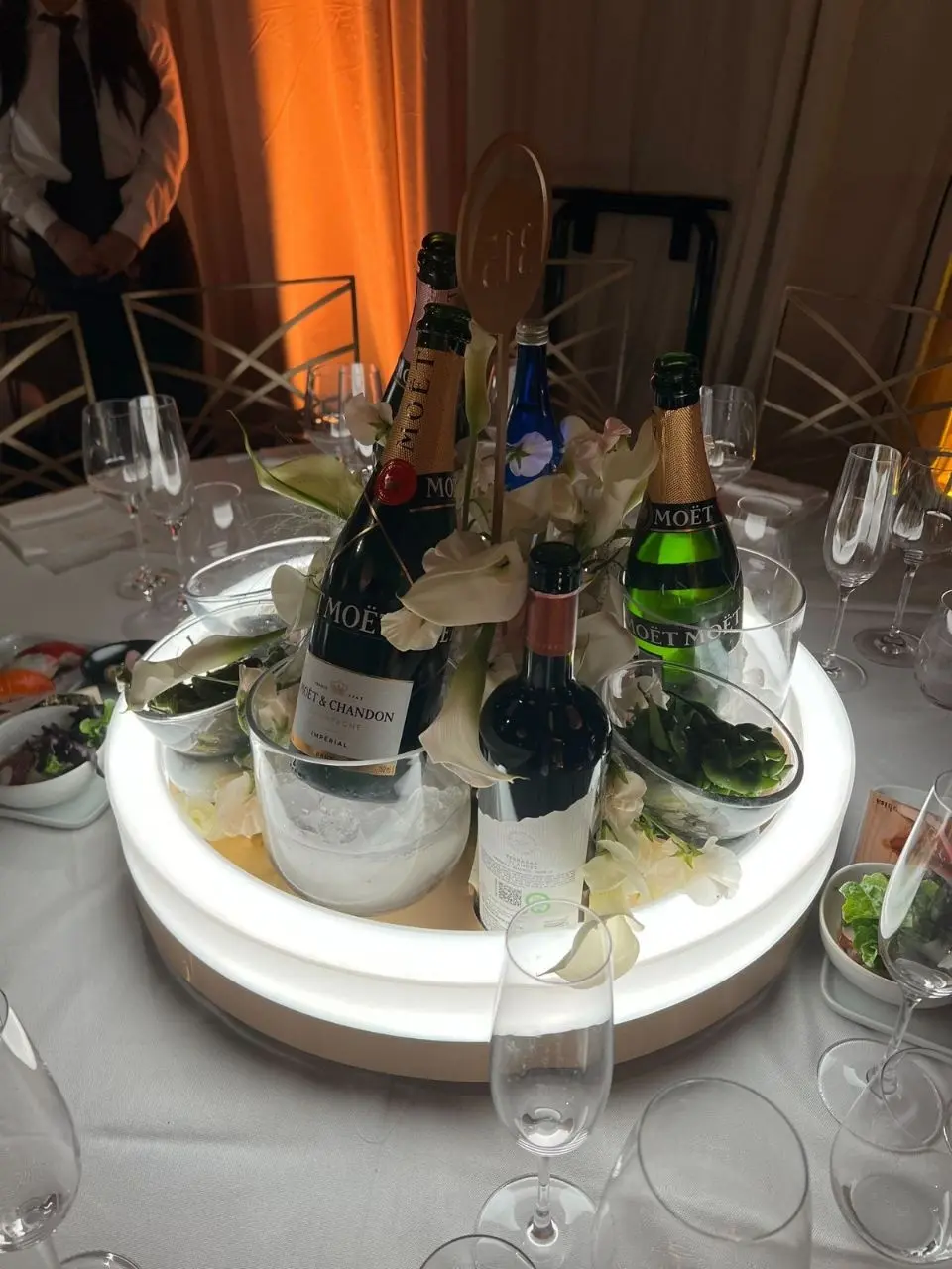 در مرکز میز، نوشیدنیها و گلآراییهای زیبا قرار گرفتهاند. گلها با رنگهای زنده و متنوع، به میز روح میبخشند و همزمان با رنگ طلایی صندلیها، هماهنگی بینظیری ایجاد میکنند. علاوه بر این، فضای بک لایت در مرکز میز، جذابیت آن را چندین برابر کرده است و فضایی خاص و دیدنی ایجاد نموده است.