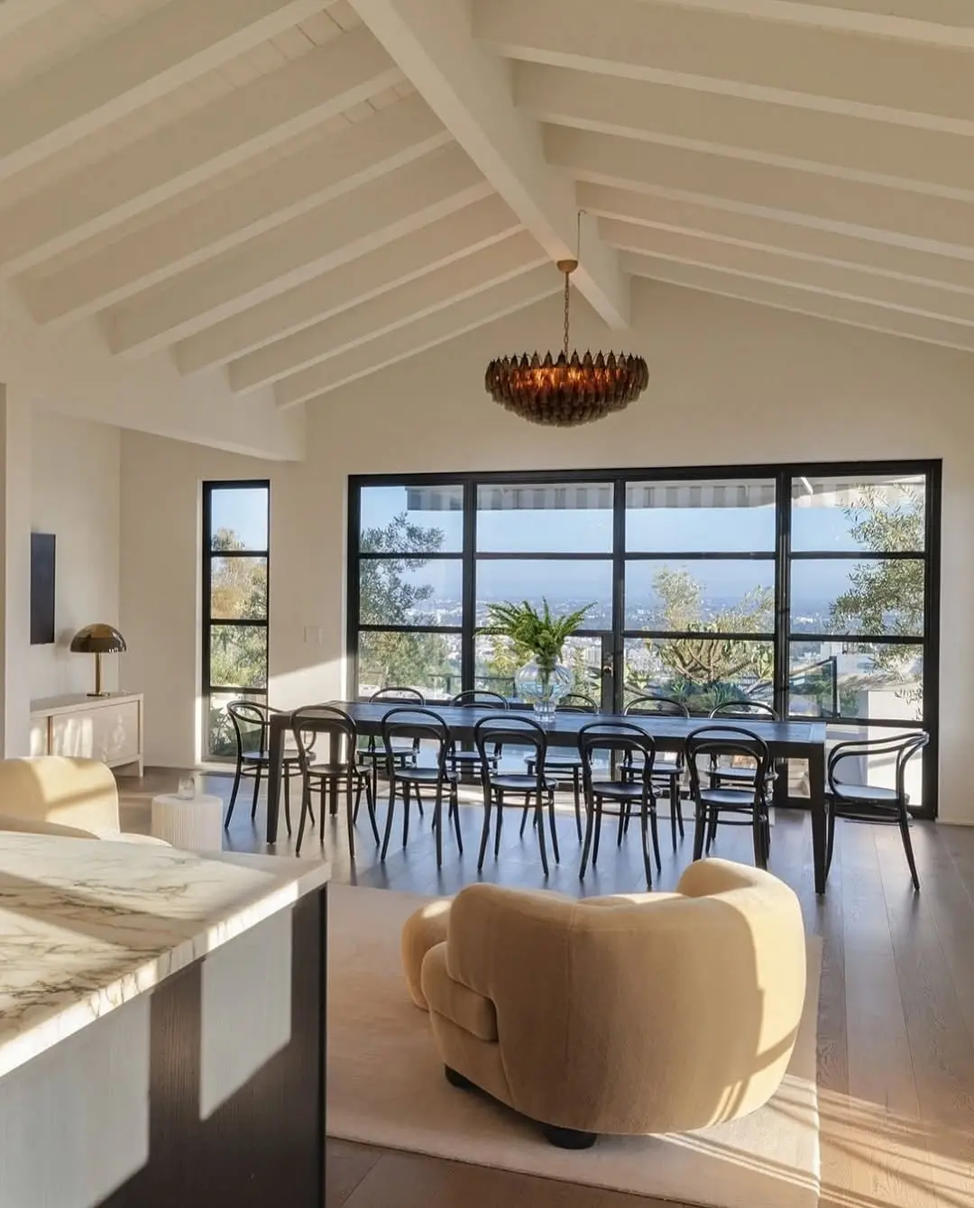یک فضای غذاخوری گرم و دلپذیر در کنار شومینه قرار دارد که به آشپزخانهای مدرن و مجهز متصل است. این آشپزخانه با کابینتهای آبنوسی و تجهیزات لوکس، ظاهر شیک و جذابی به محیط بخشیده است.