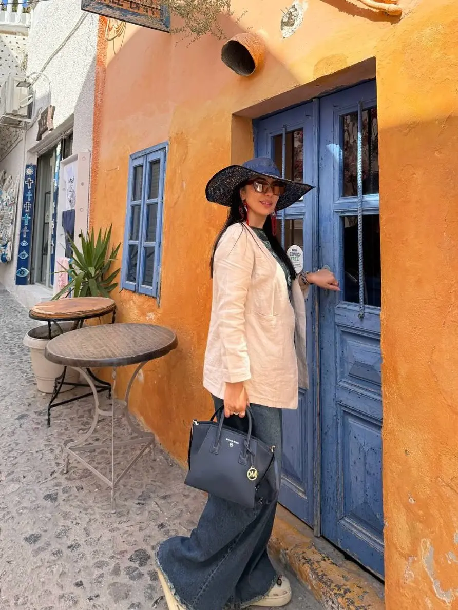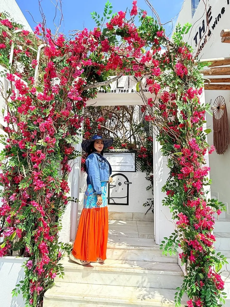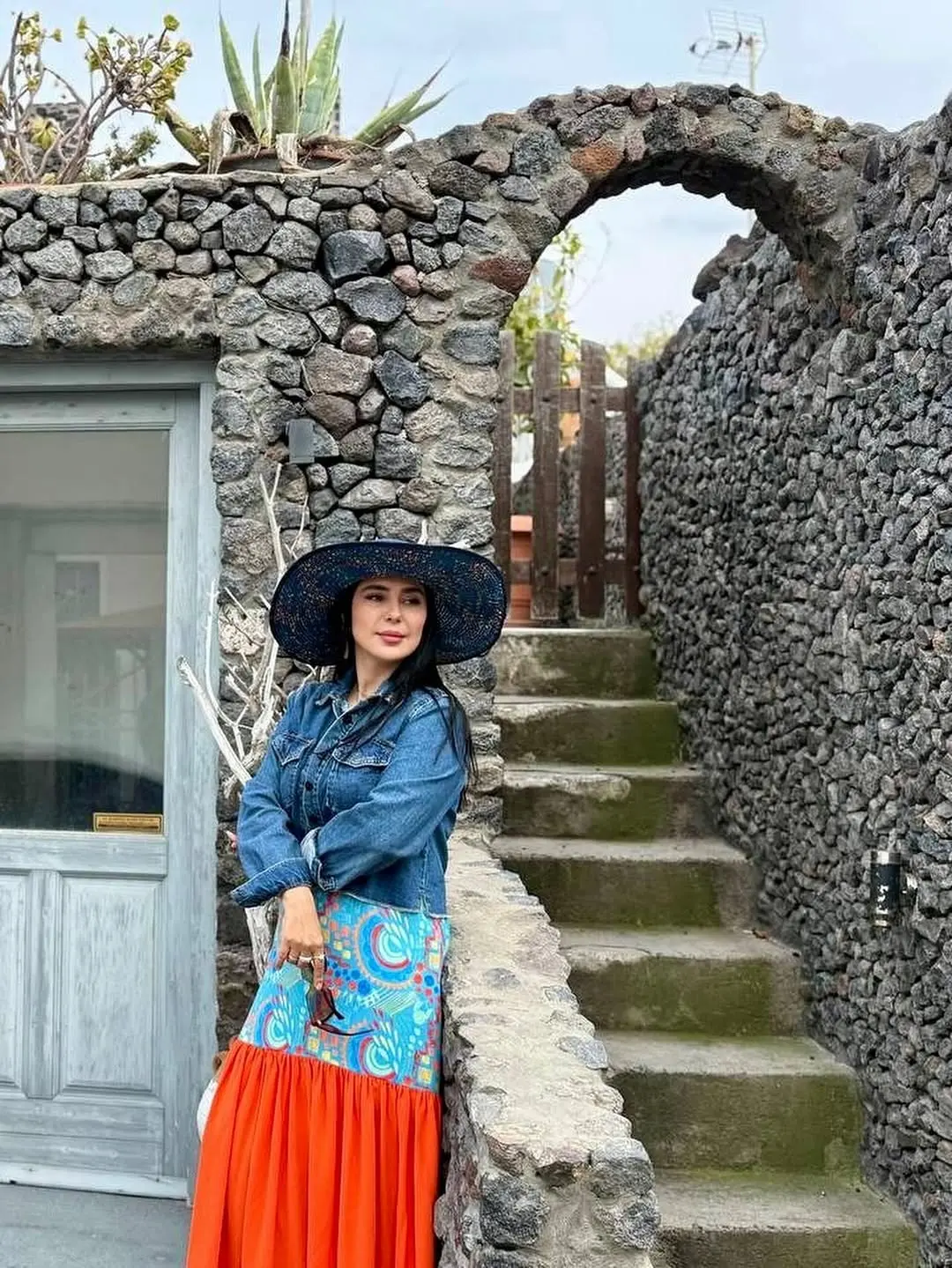 تصاویر لوکس خانم بازیگر در کافه رنگی و راهرو سنگی خارج، سفر به دنیای آرامش و زیباییشناسی با دیوارهای سنگی، مناظر مدیترانهای و لحظاتی خاص در فضای دنج و شاعرانه