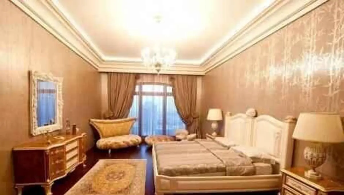 در این اتاق خواب بزرگ و با طراحی کلاسیک، از رنگهای کرمی و قهوهای بهره گرفته شده است. تختخواب با سبک کلاسیک در کنار پرده، کنسول و آینهای با طراحی مشابه، یک دکوراسیون منسجم و هماهنگ را خلق کرده است.