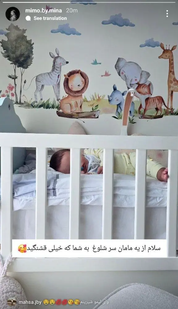 دکوراسیون اتاق کودک بهرام رادان و مینا خانم با دیوارپوش حیوانات آبرنگی، فضایی ساده، شاد و آرام برای فرزندشان فراهم کرده است.