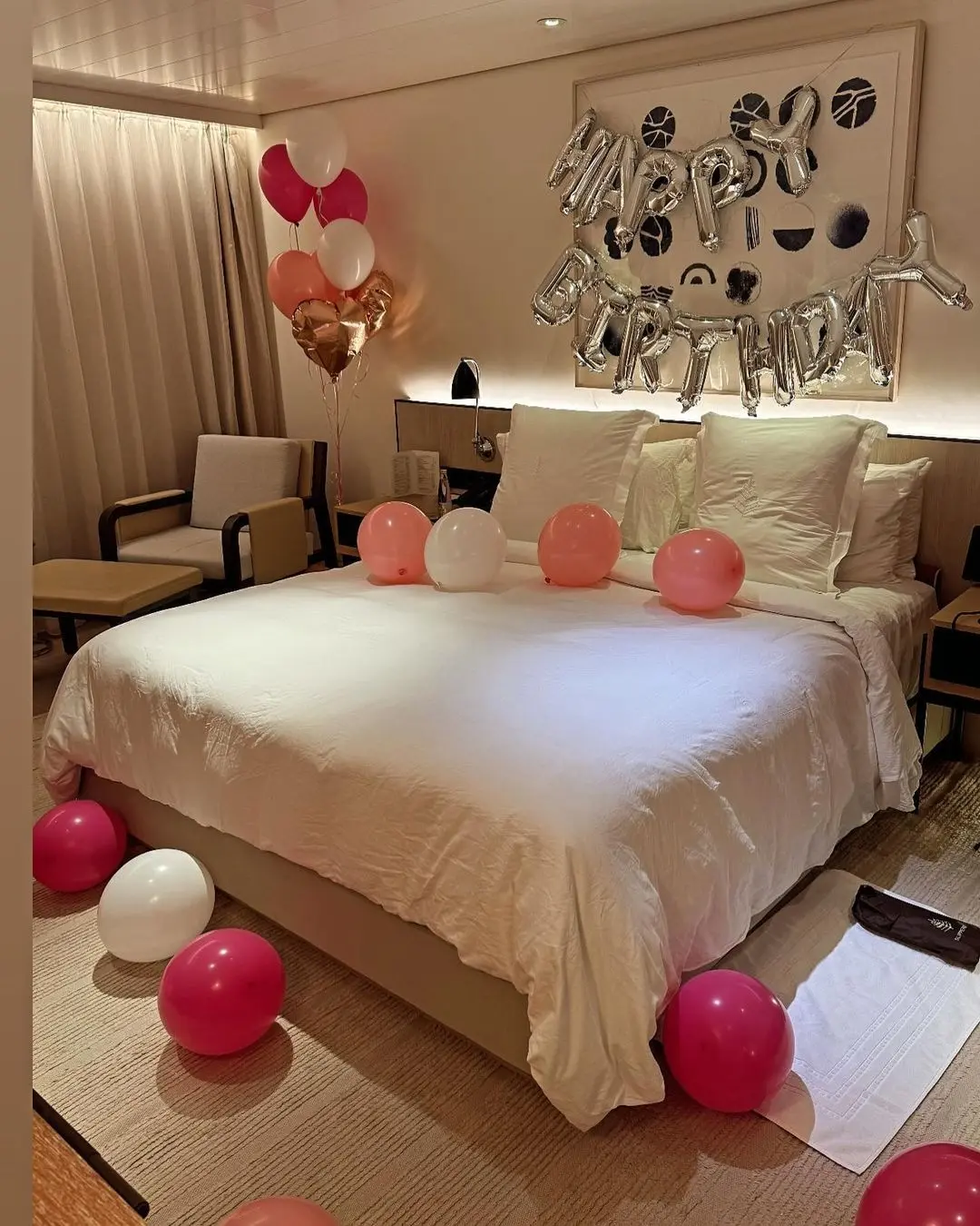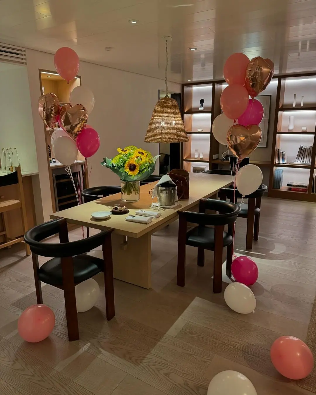 همانطور که مشاهده میکنید، خبری از تم تولد پر زرق و برق و پرهیاهو نیست و دکوراسیون فقط با چند بادکنک سفید و صورتی محدود شده است، بدون اینکه به تطابق رنگ و نوع گل با سایر عناصر توجه شده باشد. با این حال، همین سادگی فضایی خودمانی و صمیمی را برای جشن فراهم کرده است.