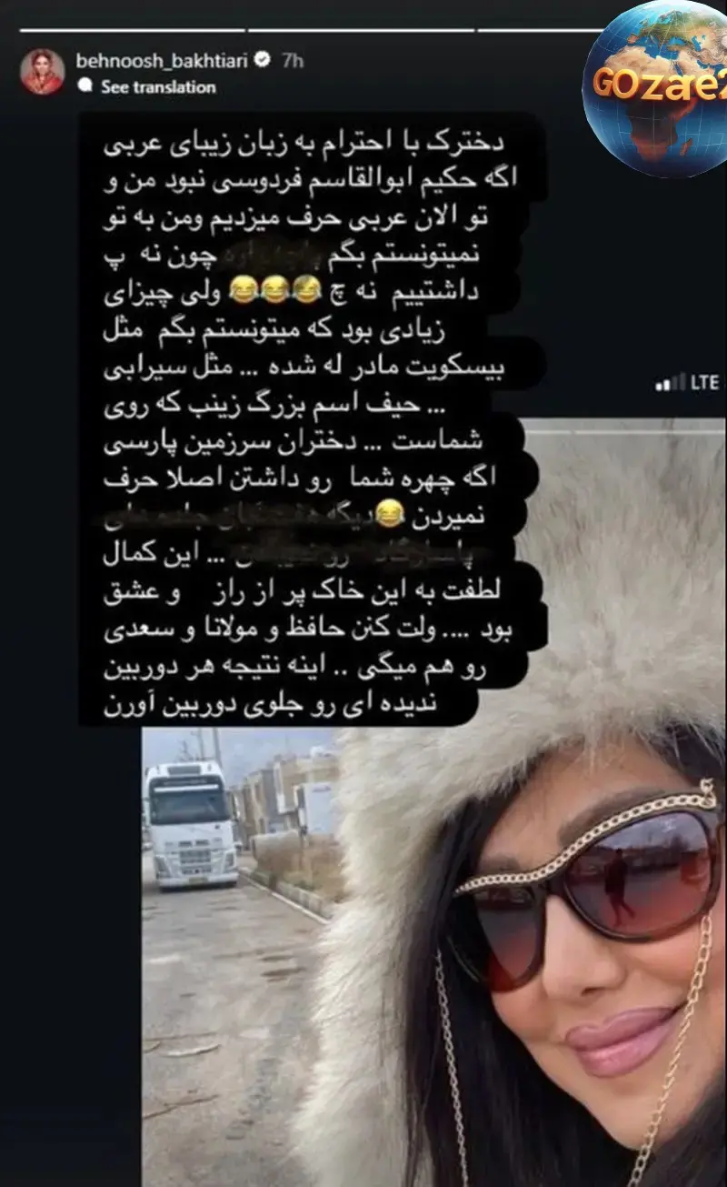 واکنش تند بهنوش بختیاری به توهین زینب موسوی به شاهنامه فردوسی؛ انتقاد شدید و حمایت از فرهنگ ایرانی در اینستاگرام