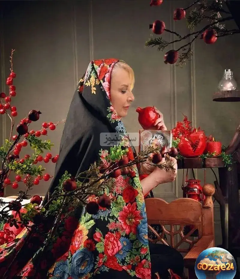 مرجانه گلچین در شب یلدا با فیگور سنتی و روسری ایرانی