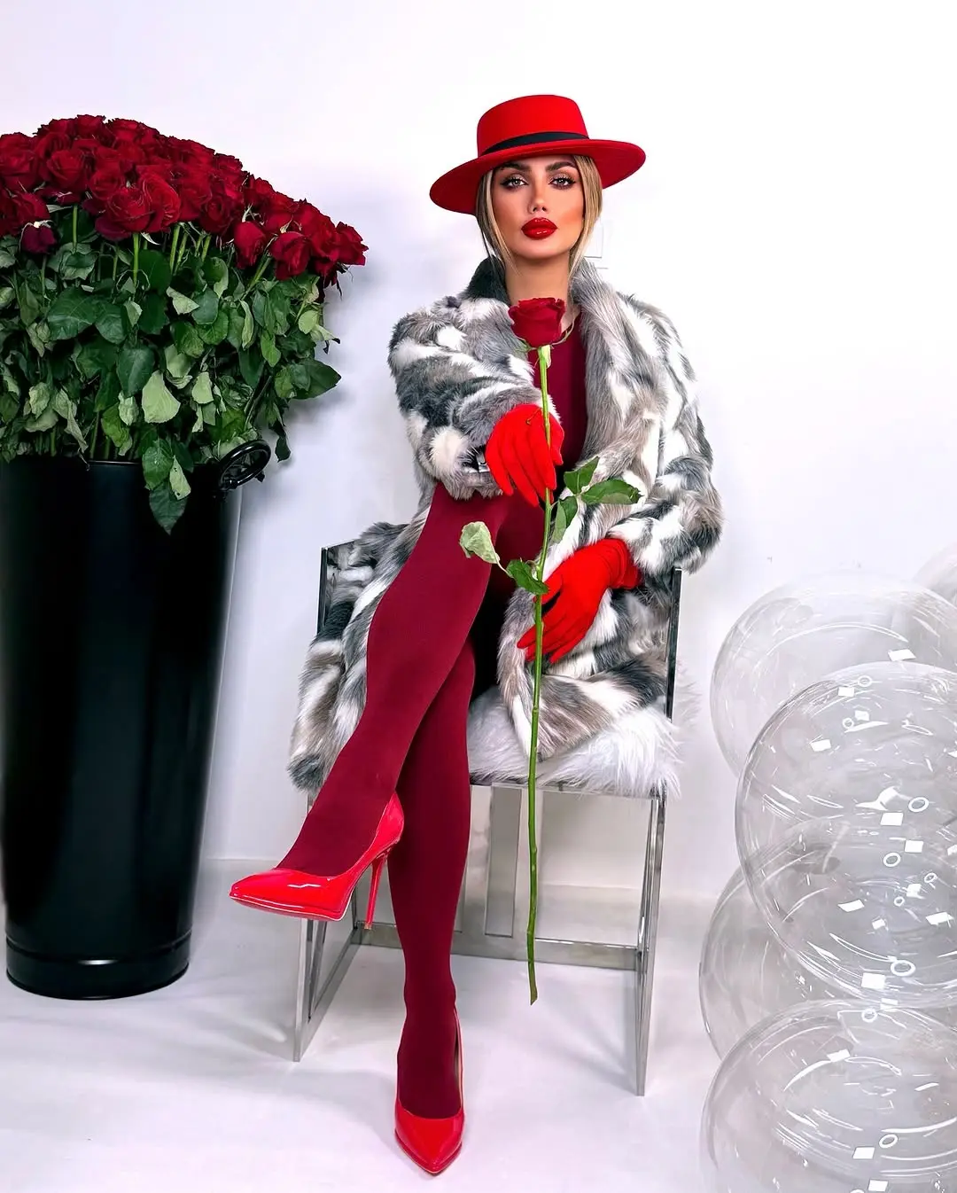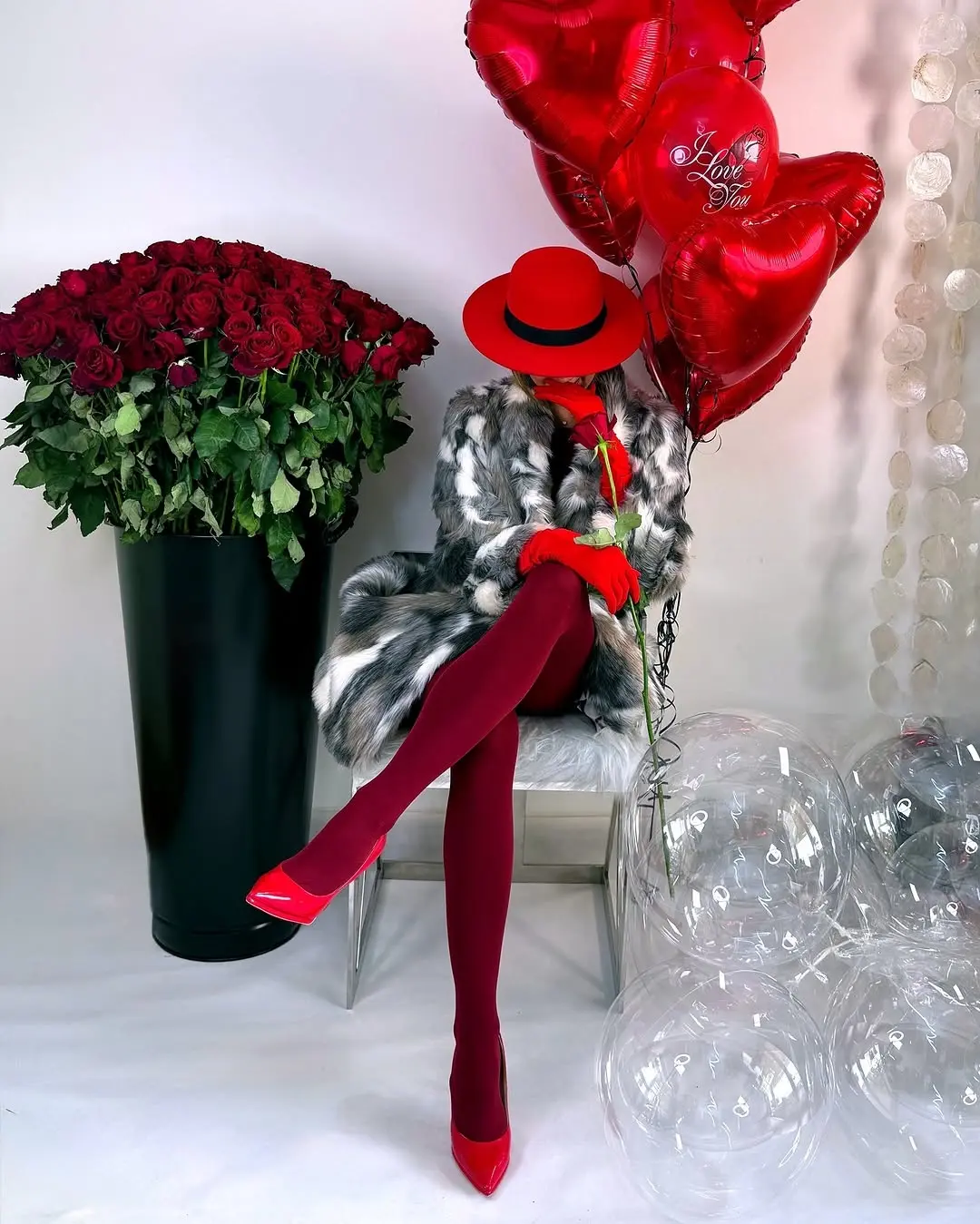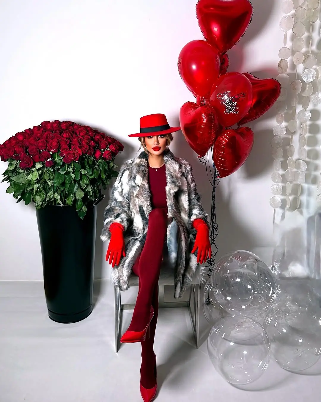 در این تصویر با دکوری جذاب و خیرهکننده رو به رو هستیم. رنگ قرمز پای ثابت روز ولنتاین است که احساس گرما، عشق و صمیمت را به راحتی منتقل میکند و به همین خاطر رنگ بادکنکها و استایل خانم تاجیک قطعا به درستی انتخاب شده است. همچنین رزهای قرمز ساقه بلند در گلدان فلزی که البته این مدل کمی خط مد خارج شده است به فضا احساس لاکچری را بخشیده است و اما ترندیترین آیتم این دکور ریسههای پولکی در گوشه تصویر است که باعث به روز دیده شدن میشود.