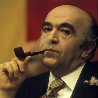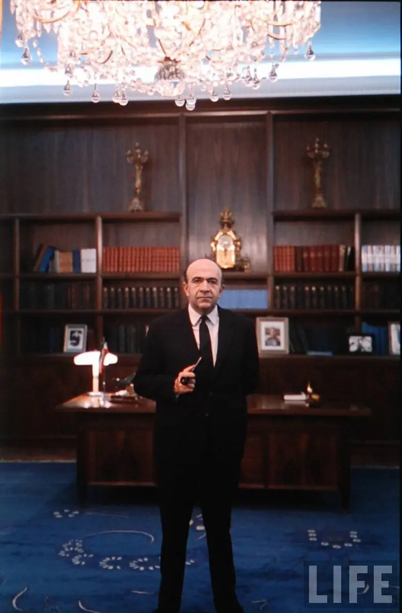 تصویری از دیمیتری کسل، امیرعباس هویدا، نخستوزیر ایران، در اواخر دهه چهل شمسی در دفتر کار او ثبت شده است. این فضا، یک اتاق کار با طراحی کلاسیک، با دکوراسیونی لوکس و شیک است که احساس جدیت و وقار را القا میکند. استفاده از چوبهای تیره، لوستر بزرگ و وسایل دکوری مجلل، حس شکوه و عظمت را به بیننده منتقل مینماید.