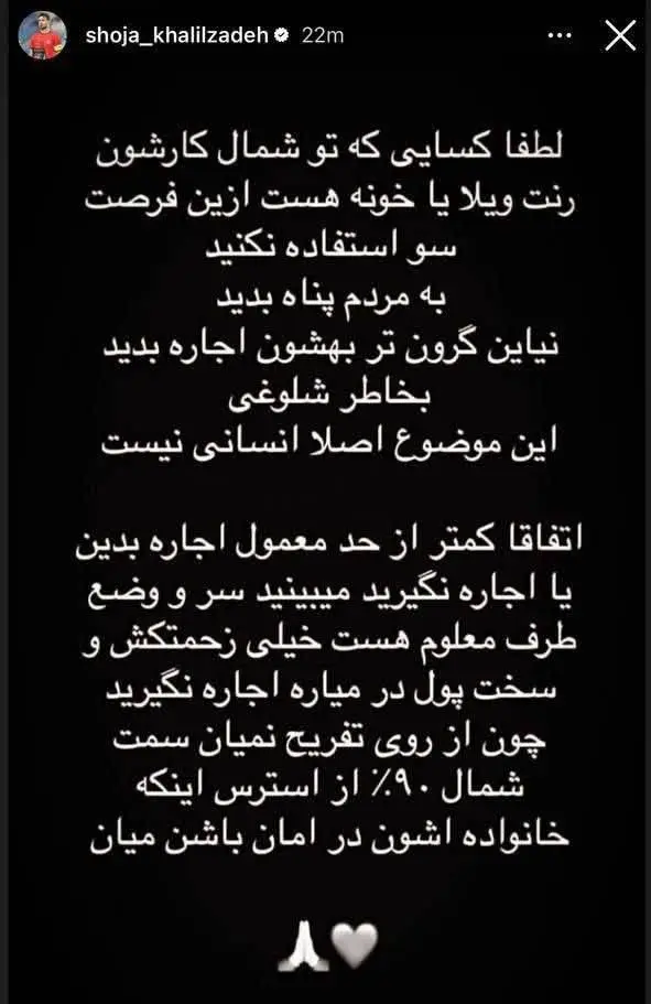 در روزهایی که امنیت و آرامش برای بسیاری از خانوادهها اهمیت ویژهای دارد، آقای شجاع خلیلزاده، بازیکن فوتبال، احساسات و نگرانیهای بسیاری را بیان کرده است.